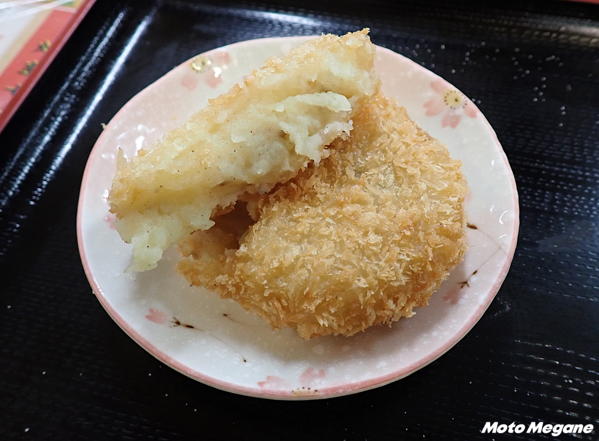 道の駅オリジナルのコロッケ。鹿肉は挽肉ではなく、コロッケの中に1cm角強の角切りの鹿肉が入っている。鹿肉は臭みが無くほくほくのじゃがいもとマッチしている。