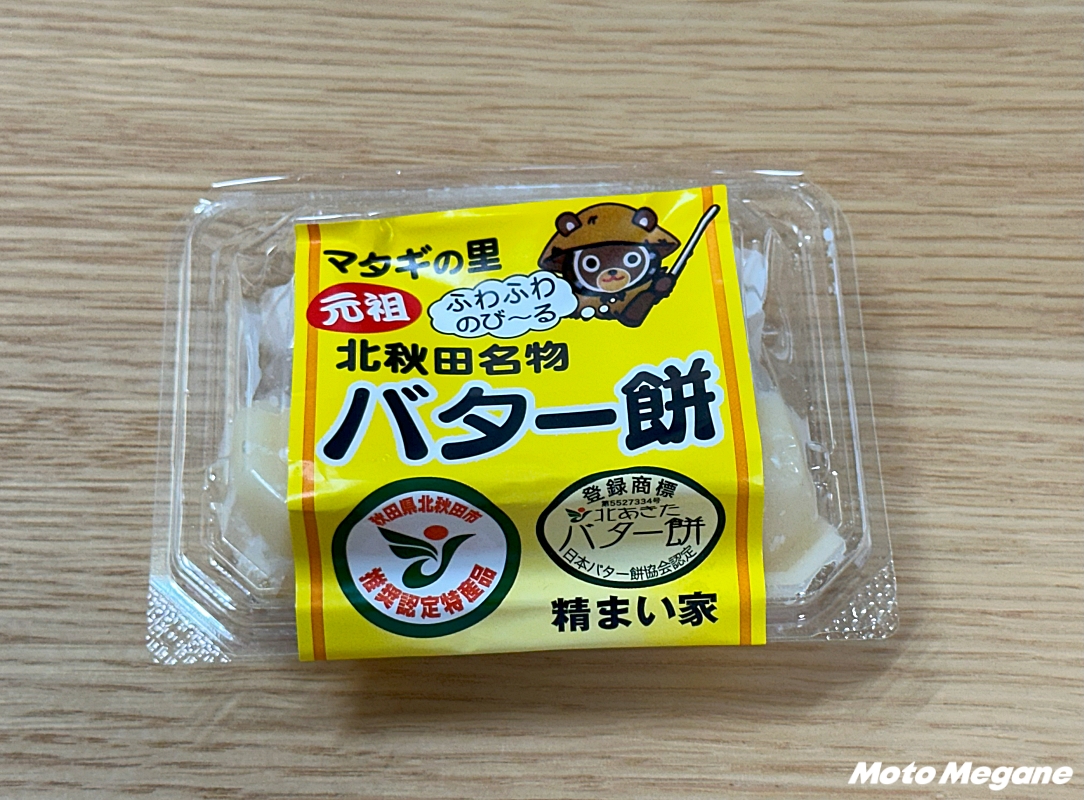 北秋田市名物のバター餅。昔はマタギの保存食として食べられていた。もち米に、バター、砂糖、卵黄を加えて作られており、バターが入ることで時間が経っても固くならないのが特徴だ。