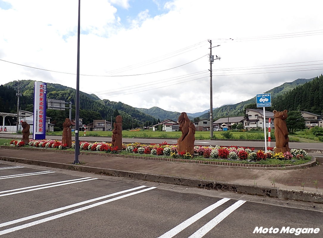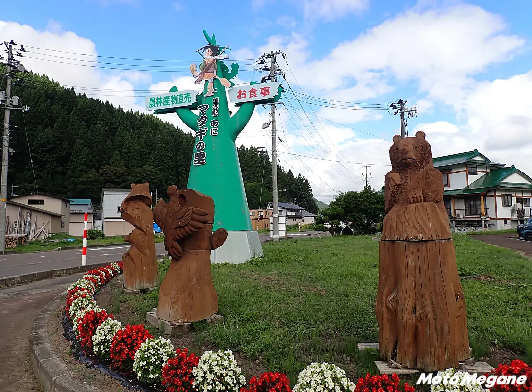 『道の駅 あに』は、秋田市に南に位置。R105沿いにあり、アクセスは抜群。道の駅のある阿仁地区は山間地域で、マタギ発祥の地として「マタギの里」と呼ばれている。建物の前には、チェーンソーアートで作られた動物などの木彫りの像がズラリと並び、出迎えてくれる。