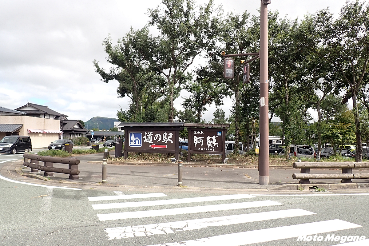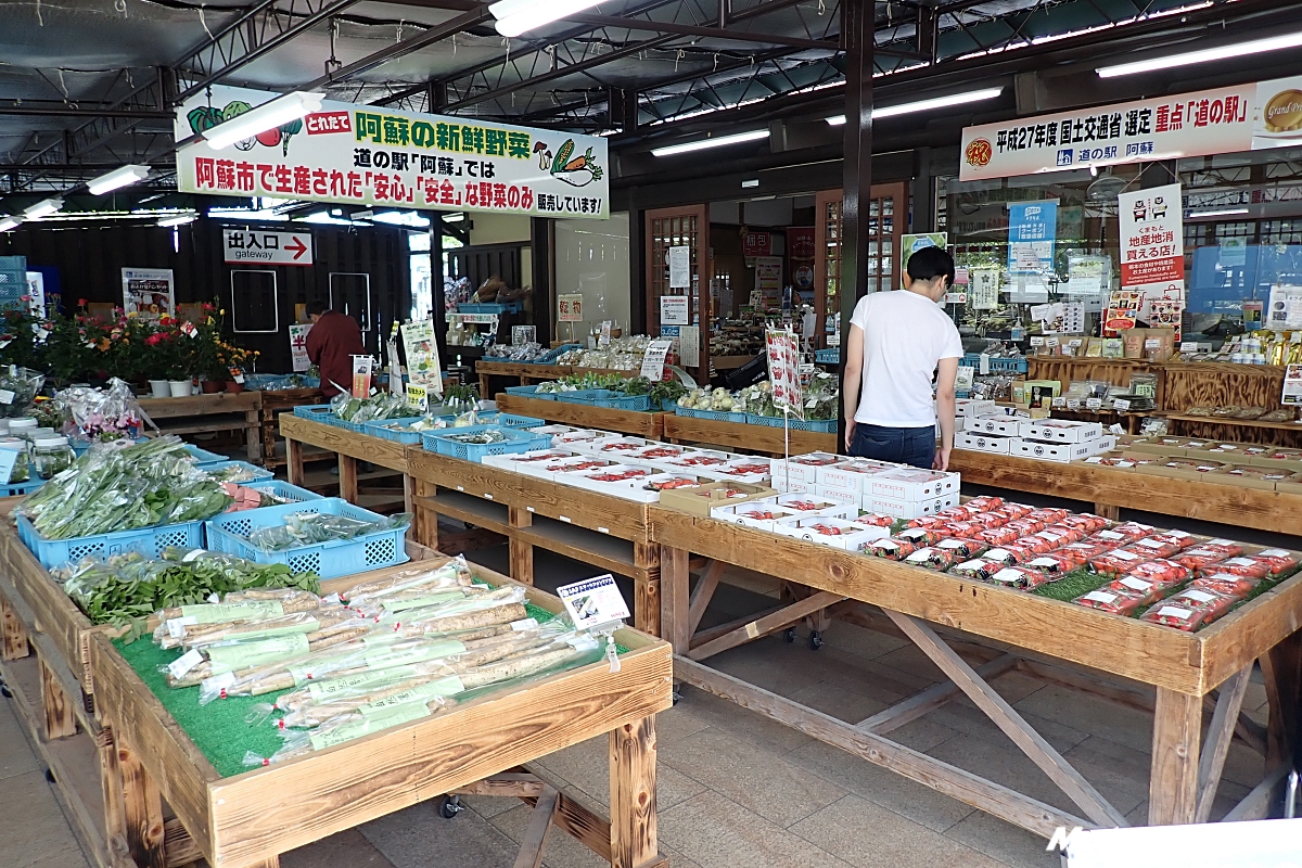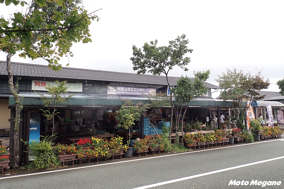 『道の駅 阿蘇』はR52に面しており、アクセスは抜群。駐車場内にはバイク専用の駐車場も整備されている。施設内には特産品販売所と観光案内窓口があり、建物入り口には産直野菜のコーナー、建物正面にソフトクリーム販売所が設置されている。特産品販売所には高菜漬けや、いきなり団子、あか牛の商品、ソーセージなど特産品や土産品が数多く取り揃えられている。旬の野菜や果物などの農産物や加工品なども充実。道の駅にレストランは無いが、あか牛を使った手作りの弁当やパンが種類豊富に販売されている。多くの買い物客で賑わう人気道の駅だ。