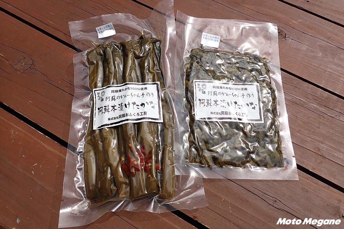 阿蘇の特産品の一つ。阿蘇地方の伝統野菜「阿蘇高菜」を使い、塩と唐辛子だけで作られる。古漬けと新漬けの2種類があり、古漬けは半年かけて乳酸発酵させたもので酸味とピリ辛の味わい。阿蘇高菜を浅漬けにした新漬けはシャキシャキとした食感で、収穫期の春にだけ食べられる限定品。売店ではさまざまな種類のたかな漬けを販売している。