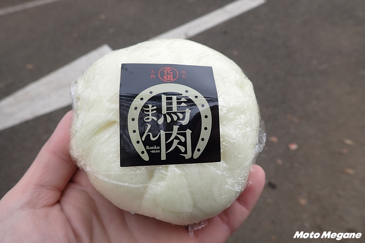 熊本の名物である馬肉を使った肉まんで、道の駅のオリジナル商品。馬肉に春雨、タケノコを加えてしぐれ煮にした具が包まれている。具の馬肉はクセがほとんどなく、食べやすい。お土産用に冷凍販売もしている。