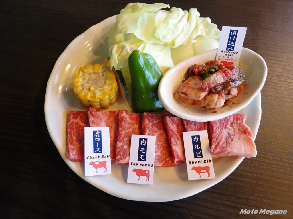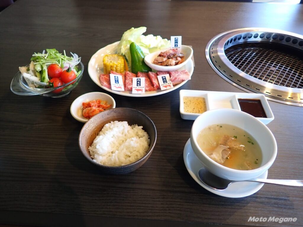 あか牛のロース、カルビ、モモ、漬け込み肉と、サラダ、キムチ、スープ、ご飯、デザートが付くセット。あか牛の館で食べられる。南阿蘇の広大な牧場で育てられているあか牛、は赤身の肉で、程よく脂肪分もあり、旨味とやわらかさが特徴。2人前5340円(税込)で、1人前から注文できる。