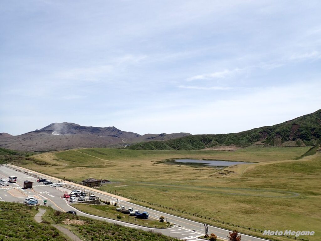 阿蘇を代表する観光スポット。噴煙を上げる中岳や、大草原と大きな池、放牧された馬など、ロケーション抜群な絶景スポット。草原は散策もでき、乗馬体験も行われている。展望所からは大草原と池の美しい景色を望むことができる。草千里では10年に1度バイクイベントが開催される。