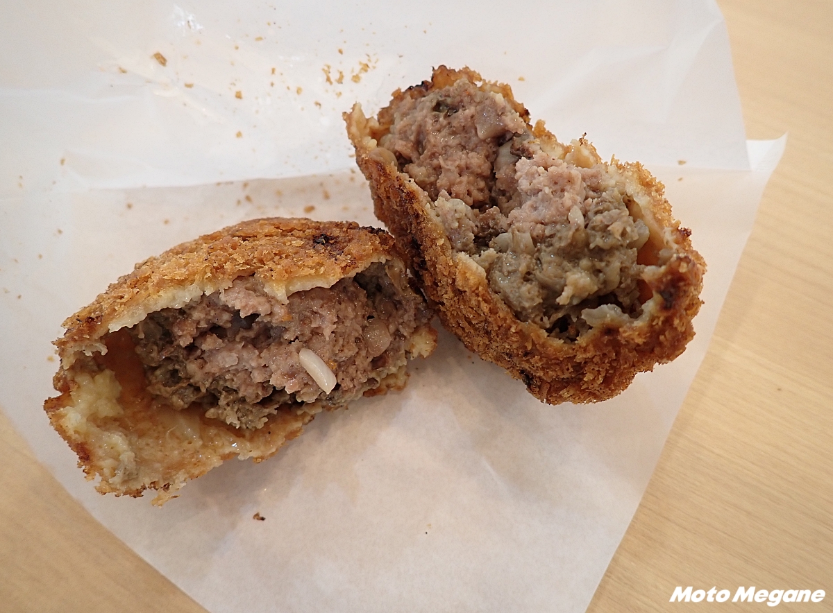 あしきた牛を使用したメンチカツ。すべて店内で手作りされ、揚げたてのが店頭に並ぶ。衣はサクサク、中はジューシー。1日100個以上、年間で5万個売れる大人気商品。