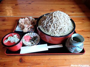 食事処で一番人気メニューは自家製の十ほかにもほかにも松本名物の山賊焼きや信州のご当地グルメソースかつ丼を味わえる。外にある「森のカフェ」では地元産の花豆やエゴマを使ったパウンドケーキ、おやきやソフトクリーム、コーヒーなどをテイクアウトできる。夏場は近隣で採れたスイカやかき氷も販売され、暑い日のツーリングに食べると最高だ。