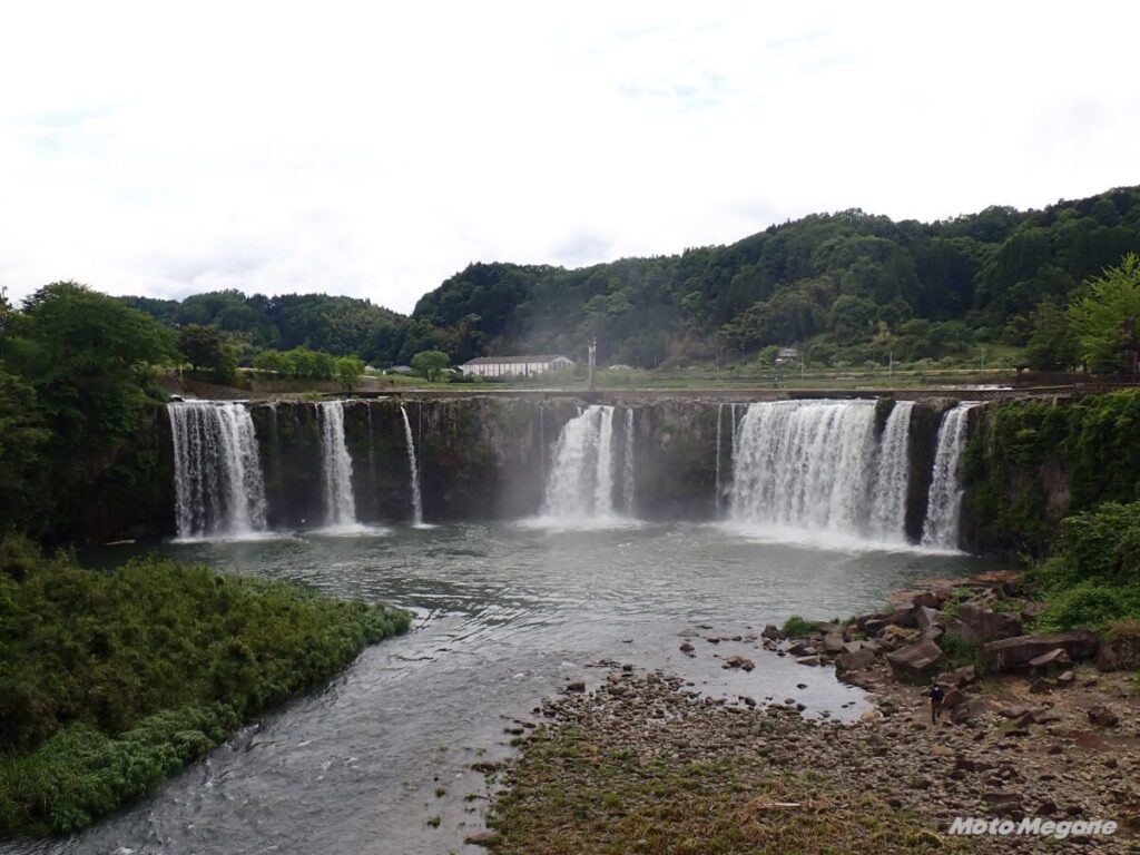 原尻の滝は道の駅に隣接しており、駐車場の端からは100mほど。滝の幅は約120m、高さは約20mもあり東洋のナイヤガラとも称され、日本の滝100選にも選ばれている。滝の周りには遊歩道が整備されていて、さまざまな場所から滝を眺めることができる。吊り橋「滝見橋」からは滝を正面に見ることができる絶好の場所。