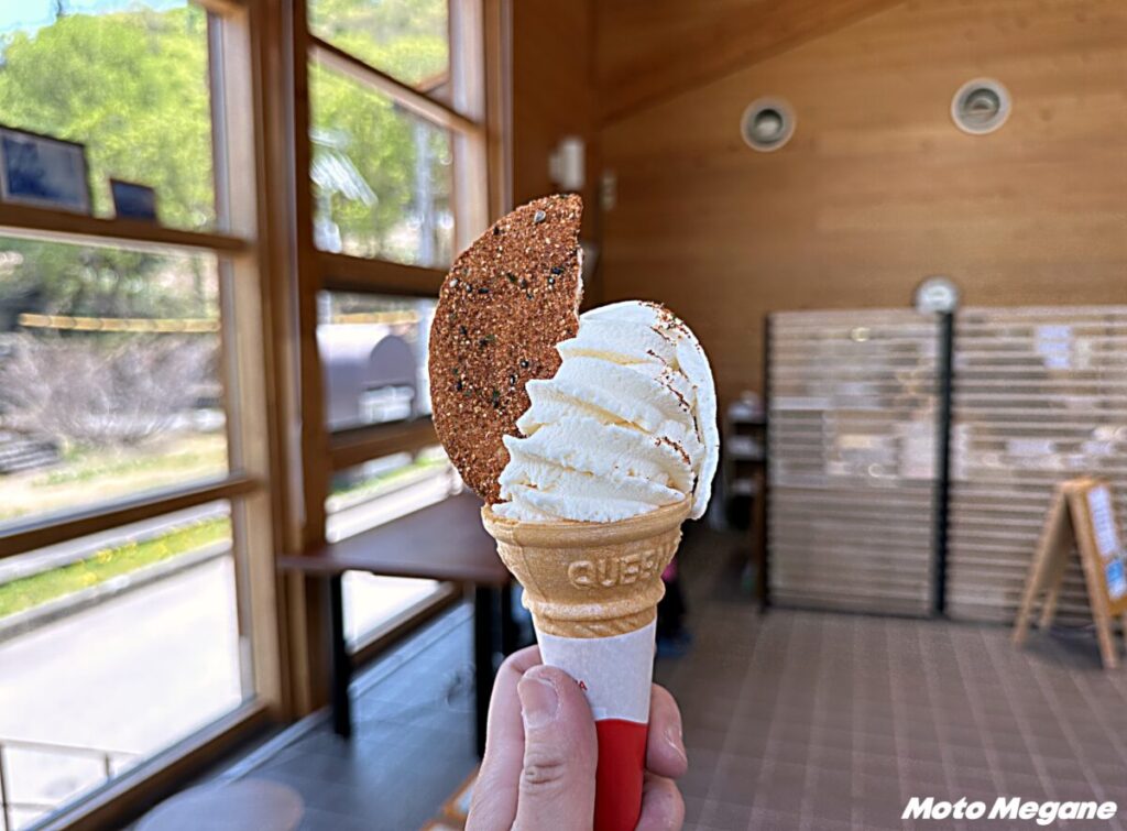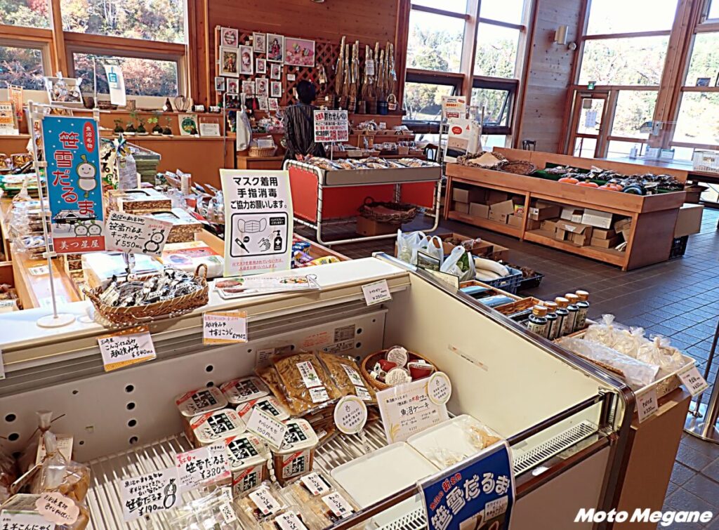 道の駅は売店・喫茶コーナーのある建物と、隣接して湖上レストランが営業。道の駅としては小規模だが、売店には地元の特産品が豊富に揃う。売店は行って正面には、魚沼産コシヒカリの「惣五郎」がズラリと並ぶ。ほかにも手焼き煎餅、笹団子やスイーツ、どぶろくまで多彩な品揃えだ。農産物では干しゼンマイなどの山菜類が充実する。レジではソフトクリームや、雪室コーヒーなども販売。七味唐辛子たっぷりで激辛の手焼せんべい「こって辛味」をトッピングした名物のソフトクリームは、「甘✕辛」のクセのある味わいを楽しめる。店内には、湖を見渡せる休憩スペースも用意されている。