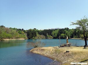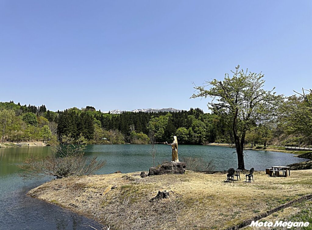 鏡ヶ池の周りには遊歩道が整備され、散策が可能。また、池のほとりにはテーブルが用意されているので、池を眺めながら休憩もできる。広場に設置された顔はめパネルは、記念撮影にオススメのスポットだ。