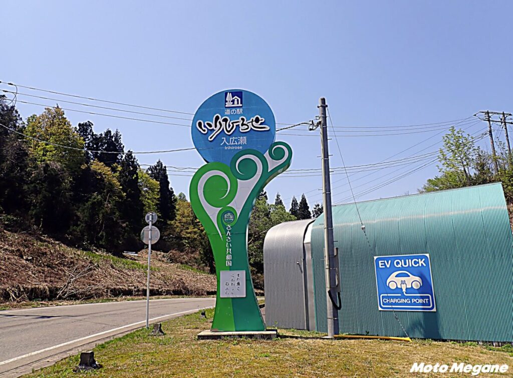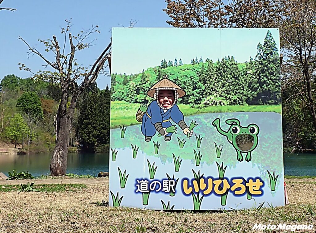 『道の駅 いりひろせ』はR252に面しておりアクセスは抜群。周辺は山に囲まれた山間地域で、道の駅建物の裏には鏡ヶ池があるなど自然豊かな場所。駐車場内にはバイク用の駐輪場も用意されている。道の駅看板にある「さんさい共和国」の文字通り、春にはたくさんの山菜が店頭に並ぶ。