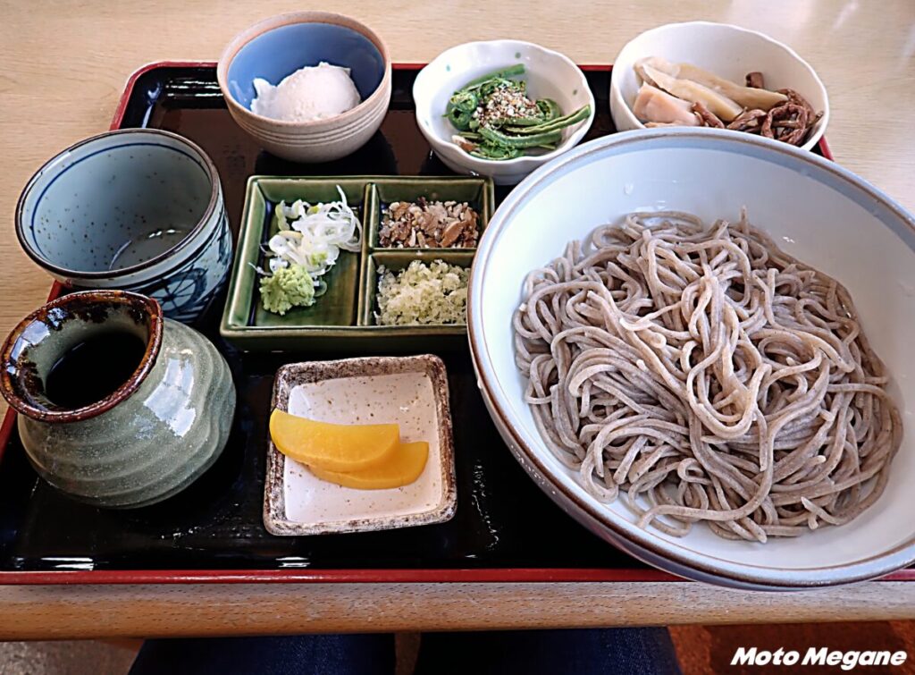 ごっぽう(オヤマボクチ)の葉の繊維をふのりと合わせてから、つなぎに使用した手打ちソバ。「ごっぽうそばセット」は、手作りの女神とうふ、山菜の小鉢、漬物がついたセットで、レストラン人気のメニューだ。