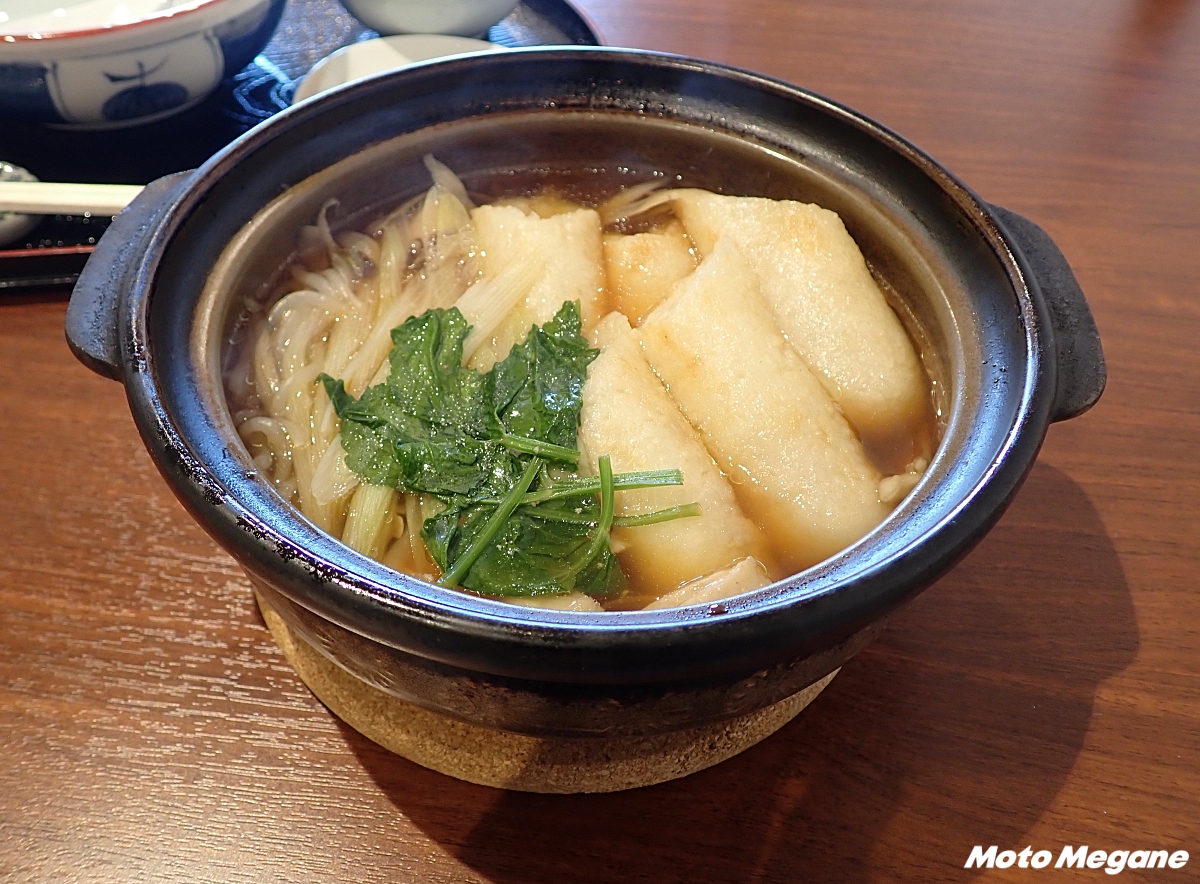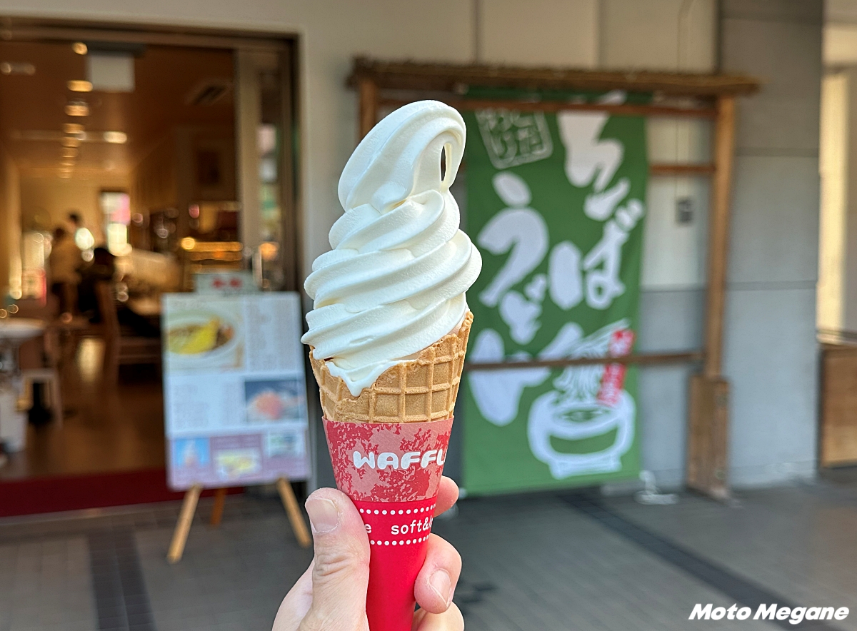 北限の桃果汁を使ったオリジナルのソフトクリームは、桃の香りとやさしい味わいで、後味はさっぱりとしている。ワッフルコーンに、しっかりとした盛りのソフトクリームだが、控えめな甘さとさっぱりとした後味で、ペロリと食べられる。ややシャーベット系のソフトクリームなので、暑い日のツーリングにはピッタリである。北限の桃のおいしさを堪能できる一品だ。