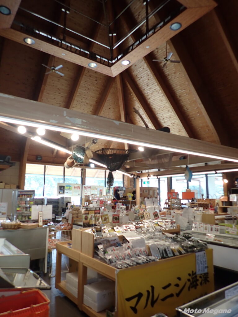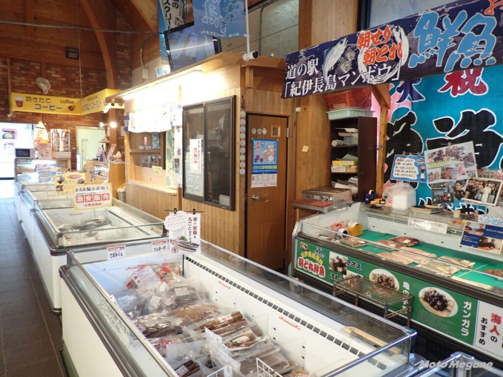 道の駅はR42に面した、紀北町の入り口に立地する。緑色の大きな三角屋根が連なった特徴的な外観は、この地方の名産「尾鷲ひのき」の形をイメージ。駅舎内には、町の名産品を中心に、さんま寿司などのにぎり寿司、鮮魚、干物、地元ならではの商品が種類豊富に揃う。11月には店頭に殻付きの生牡蠣も並んでいた。レストランではここでしか味わえない「マンボウフライ定食」や、紀北町で水揚げされた新鮮なお刺身などを地元の味を楽しめる。屋外のマンボウ屋台では大人気の「マンボウの串焼き」や「鮫の串焼き」、「うつぼの唐揚げ」など珍しいメニューも販売する。