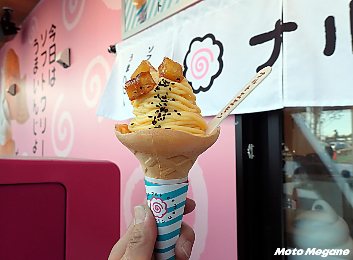 ミルクソフトの周りには芋のモンブランクリームがデコレーションされており、トッピングにはカリカリホコホコ食感の大学芋がトッピングされている。ミルクソフトは阿波和三盆糖入りでやさしい甘みで、スイートポテト風の味のモンブランクリームと相性抜群だ。このおいしさはソフトクリームというより、もはやスイーツ!