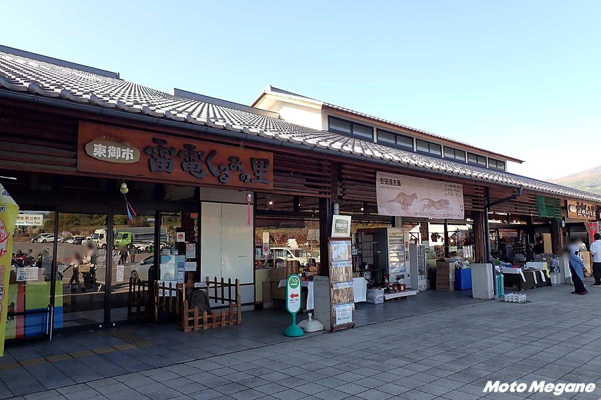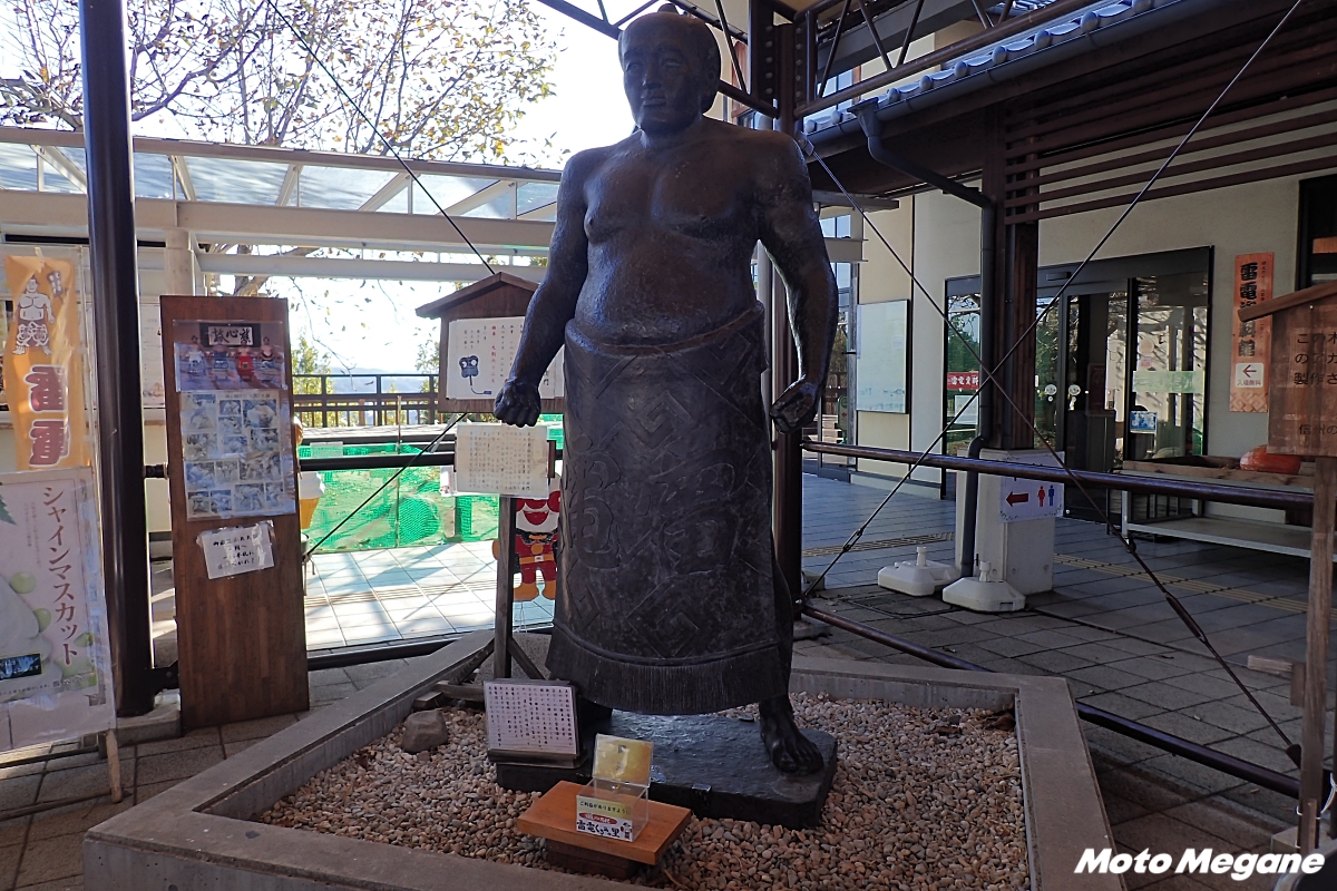『道の駅 雷電くるみの里』は、軽井沢町と上田市を結ぶ県道79号(通称・浅間サンライン)沿いに位置。施設前には広々とした二輪駐車場が用意されている。道の駅のある東御市が江戸時代の名力士・雷電の出生地ということと、日本一のくるみの産地ということから駅名が付けられた。敷地内には雷電の銅像も建てられている。