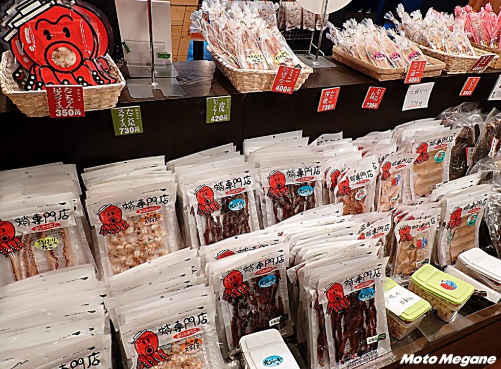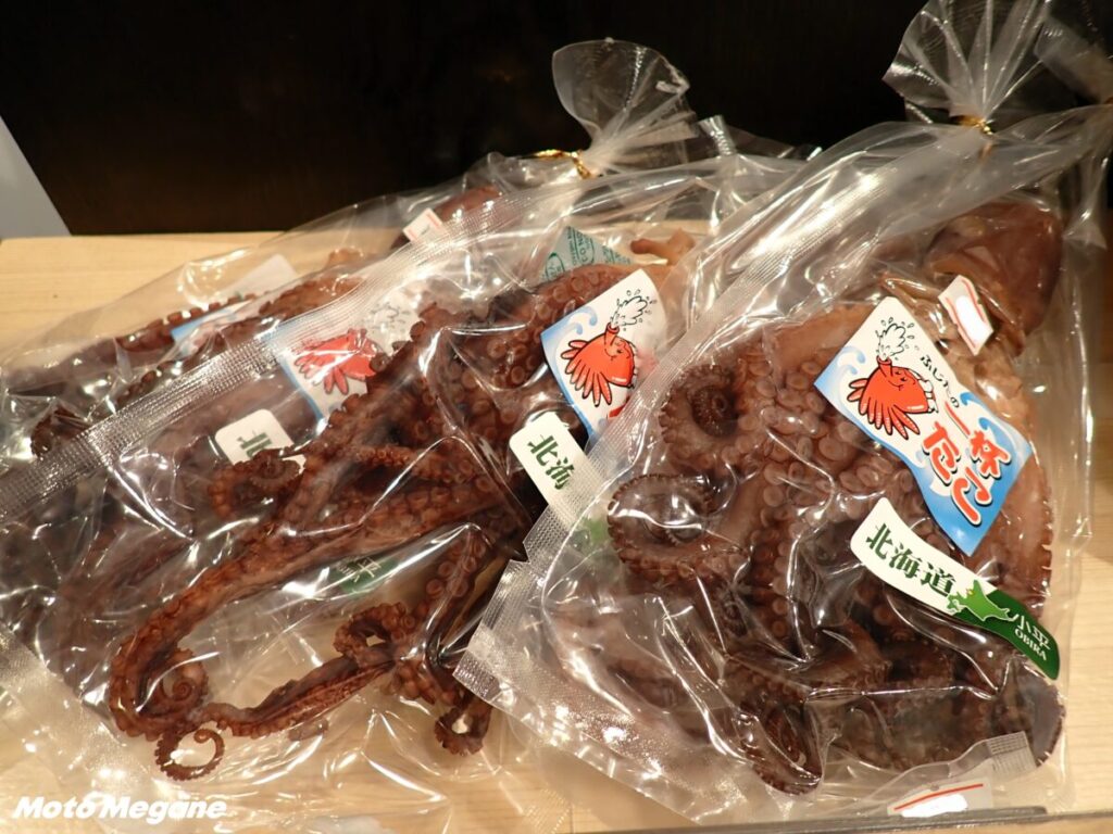 小平町は日本有数のタコの産地で、日本海北部のミズダコは味が良いと評判。道の駅売店には、特産のタコを使った珍味が豊富に揃う。たこ皮ジャーキー、「ひっぱりだこ」などバラエティー豊かでお土産におすすめ。酢だこなども販売している。