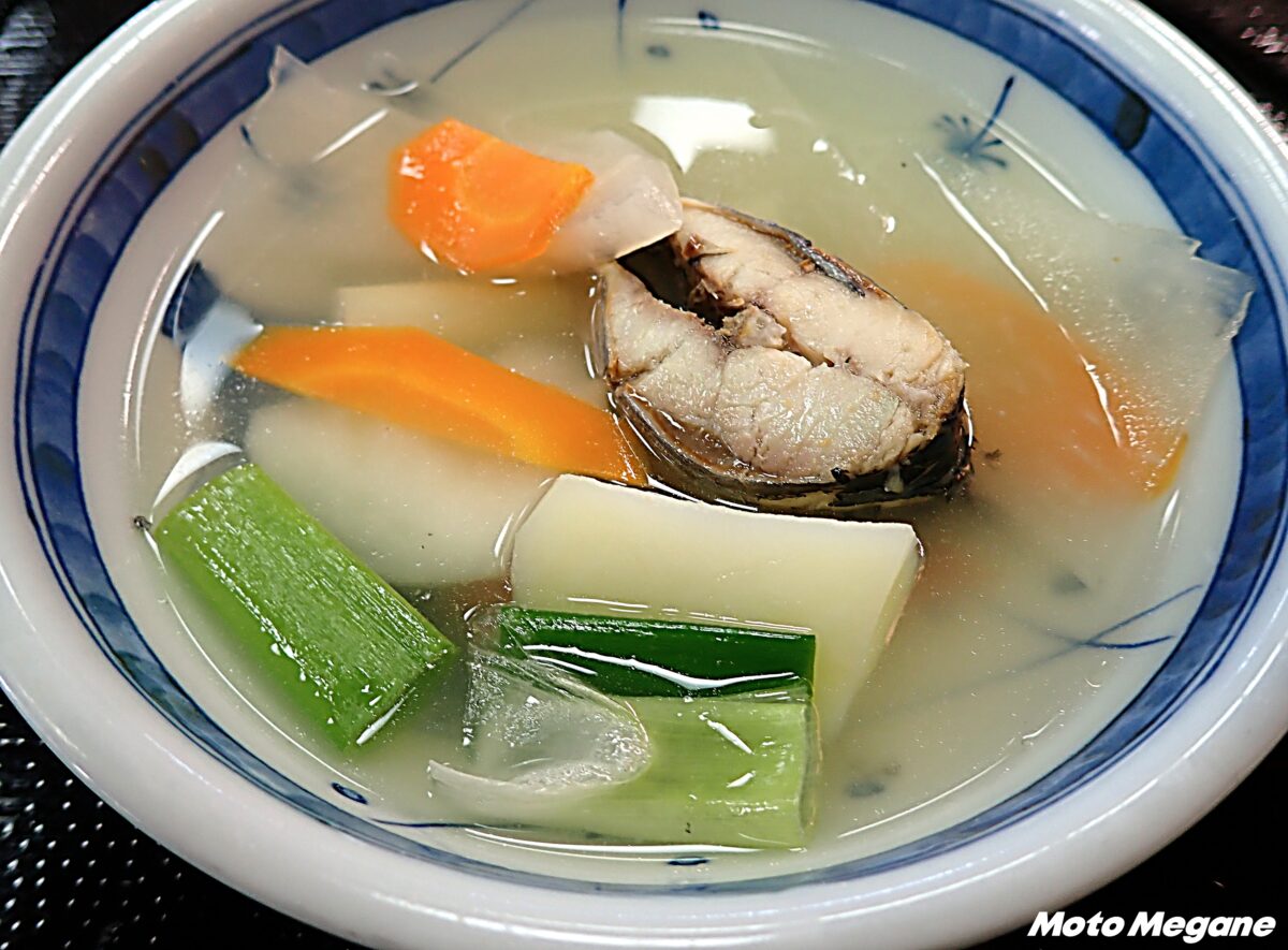 糠ニシンをダイコン、ニンジンなどの根菜と一緒に煮込んだ郷土料理。スープはやや濃い目の塩味だが、クセになる味。専用の三平皿に盛り付けられてくる。道の駅名物で、人気のメニュー