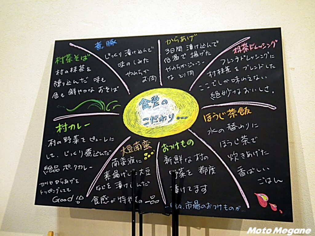 道の駅施設には、「のもん市場」、食料品や日用品を扱う「村民百貨店」、食堂、ファストフードコーナー、観光案内所が入っている。「のもん市場」では、採れたての産直野菜や特産品のお茶など、村で作られたものを販売。お茶商品は、抹茶や煎茶、スイーツなどバラエティ豊かで、特に村茶を使用したオリジナル商品が人気。道の駅内にある工房で手作りされる「むらちゃプリン」やパウンドケーキは絶品だ。村のお母さんたちが作る手作りのお弁当や惣菜類も販売している。