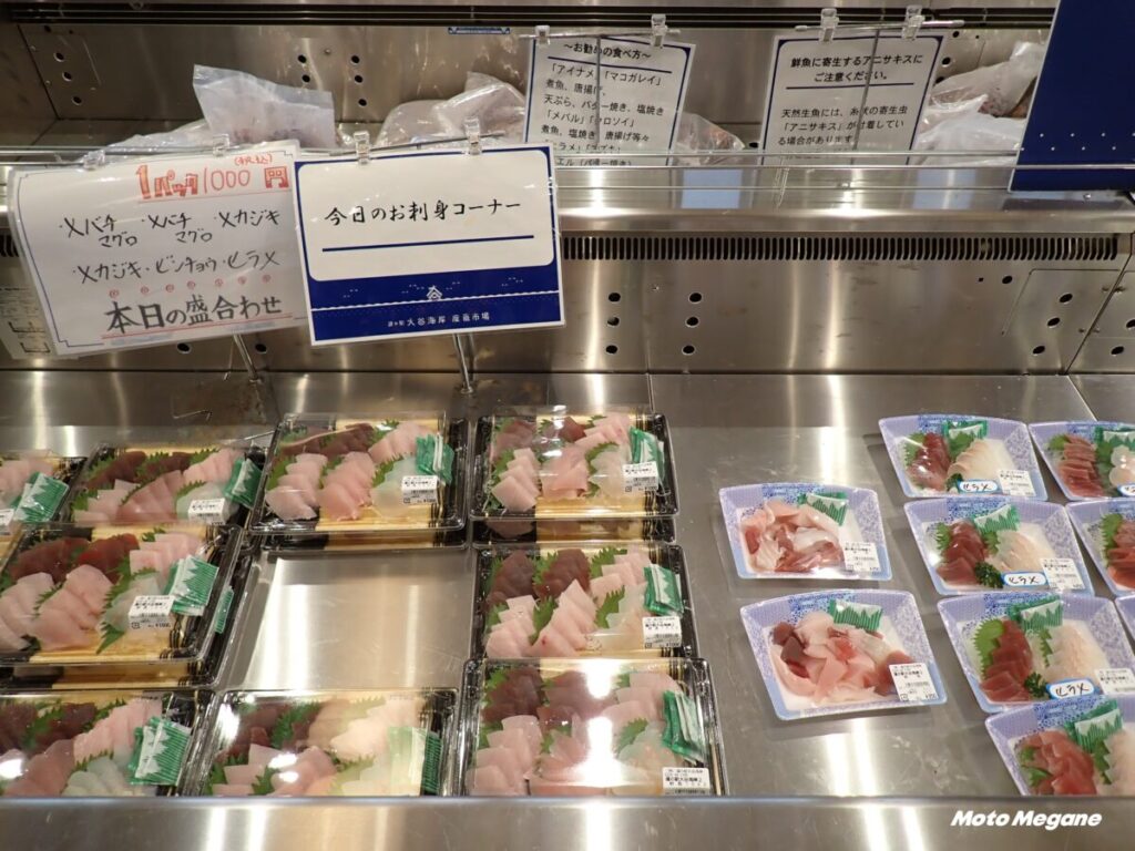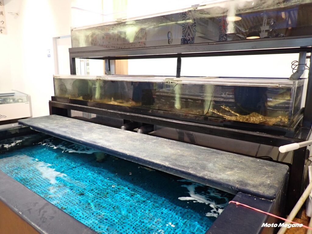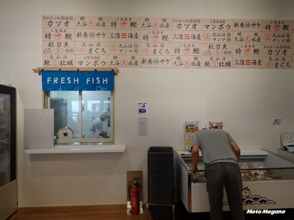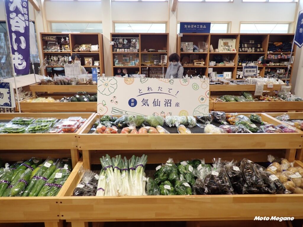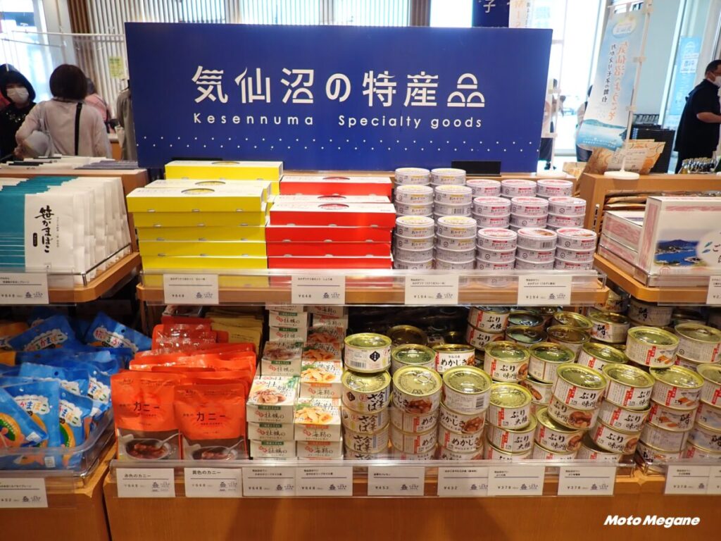 道の駅は「オール気仙沼」をテーマに、気仙沼産の食材や特産品などを豊富に取り揃える。産直市場では、地場の新鮮野菜や海産物、お土産品や地場食材を使った手作りの弁当などがぎっしりと並び、店内に設置される水槽では活魚も販売している。