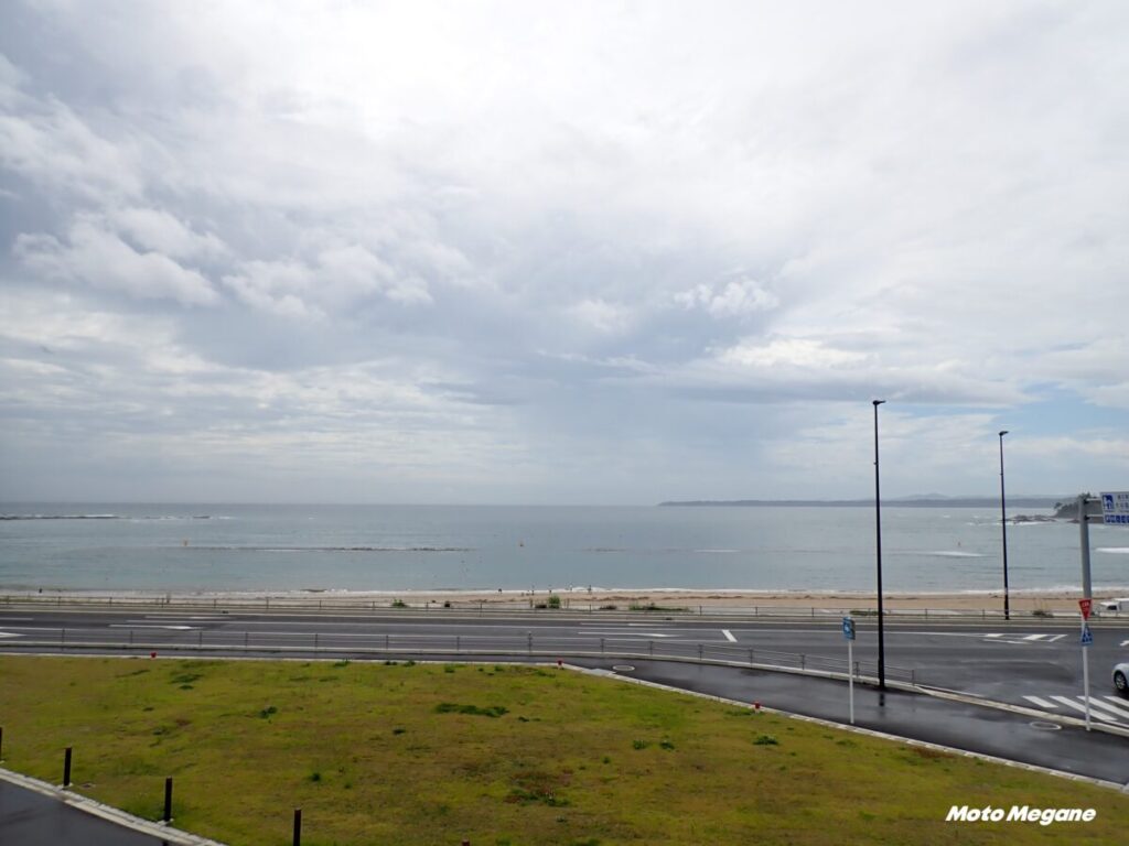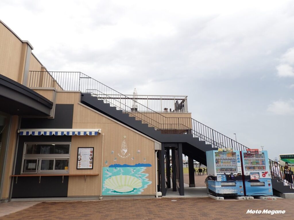 外階段を上がると2階部分が展望デッキとなっており、大谷海岸と太平洋を見渡すことができる。デッキにはカウンター席やテーブル席が設置されているので、テイクアウトした商品はここで食べることができ、展望デッキは24時間利用可能となっている。