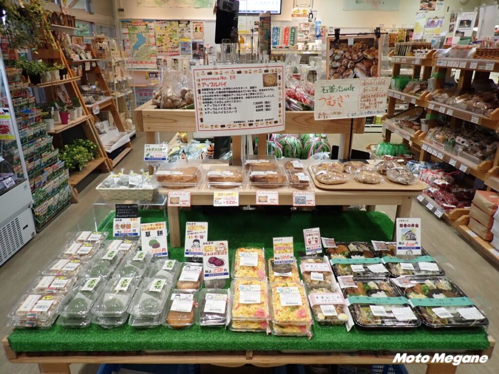 売店には、永源寺こんにゃくや政所茶など地域の特産品や、手作りの弁当類やパン、地酒や地場農産物などが並ぶ。東近江市が発祥のキャラクター「飛び出し坊や」のグッズも販売。カッティングシートや文具など、多彩なグッズが揃っている。