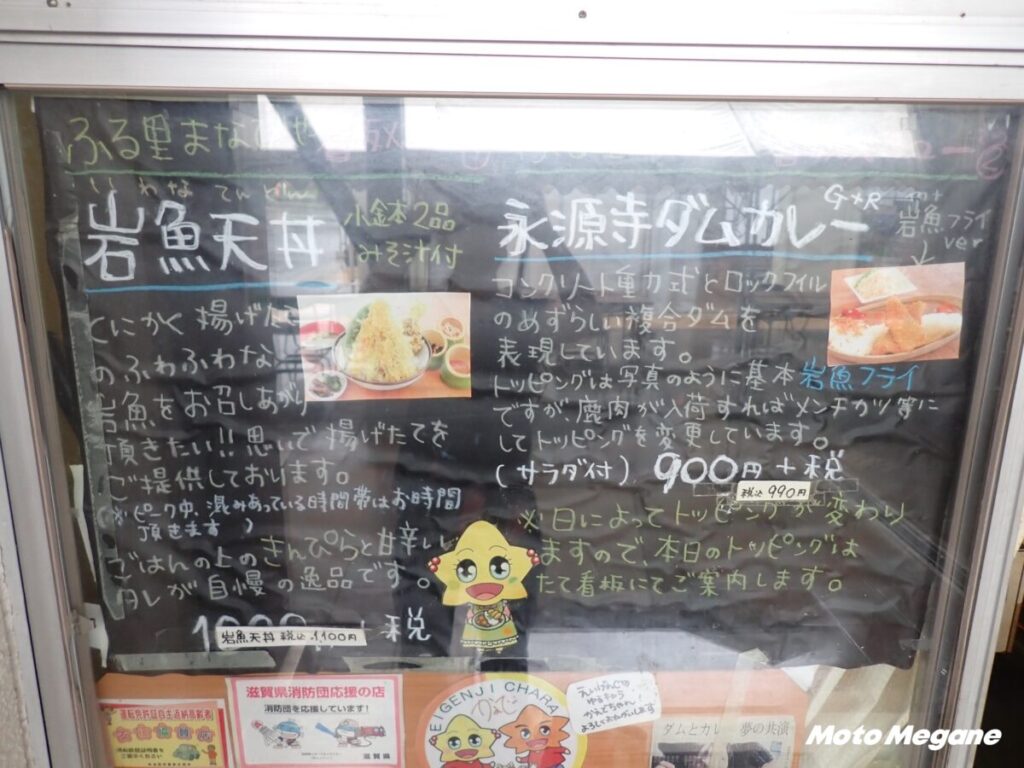 永源寺ダムを再現したダムカレー。 コンクリート重力式とロックフィルの複合ダムの珍しい形の堤防をご飯で再現。カレールーをダム湖に見立て、流木などをイメージした具材が浮かぶ。トッピングには岩魚のフライや、入荷次第では鹿肉やイノシシ肉のメンチカツが日替わりでのる。見た目でも楽しめ、ボリュームも満点の一品。