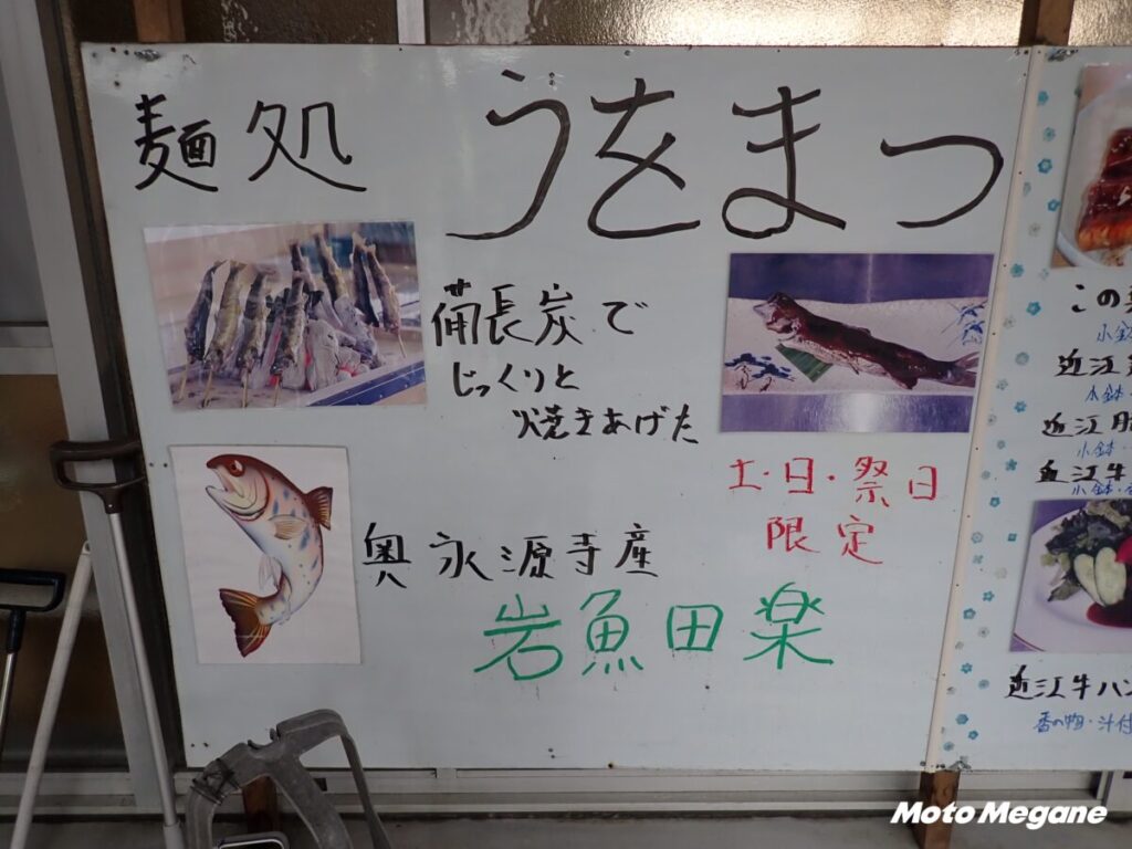 食事処は2店舗あり、「ふる里まなびや」では、永源寺ダムカレーや岩魚天丼などを提供、「うをまつ」では、近江牛を使ったメニューや岩魚田楽などを味わえる。
