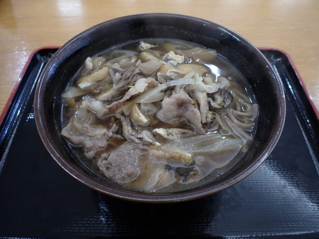 奥出雲和牛と奥出雲舞茸を使用したそば。島根の名水百選に選ばれた「延命水」を使い育てられた奥出雲舞茸は地域の特産品でもある。奥出雲和牛は地域のブランド牛で、柔らかな肉質で、コクと甘みがあり、肉本来の風味がしっかりとした味が特徴。2つの特産品がコラボした旨味と風味がある贅沢なそば。