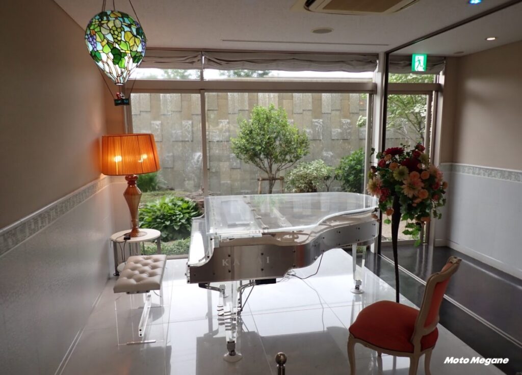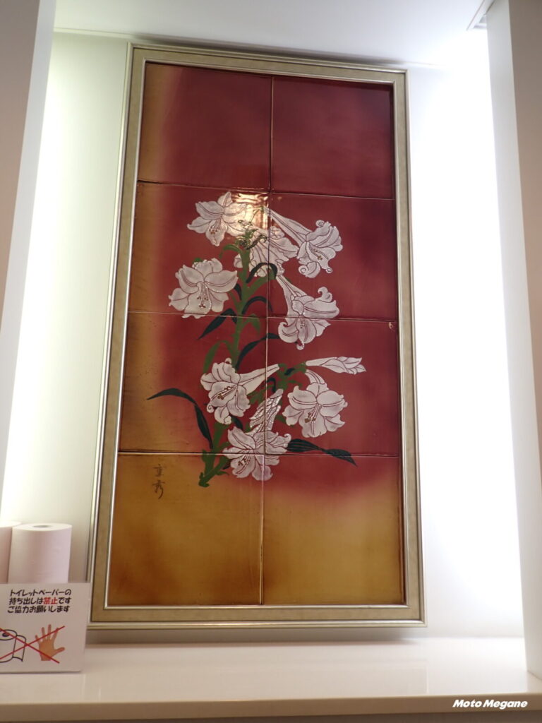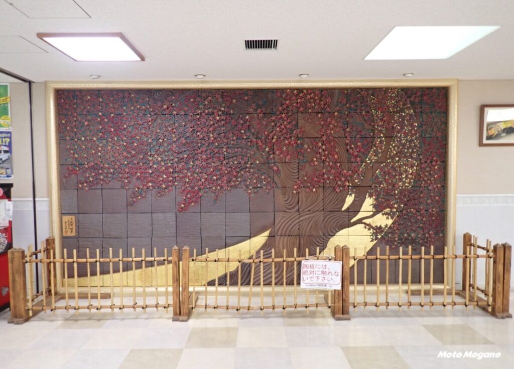 「もみじ館」入り口を入ると、正面にはクリスタルのグランドピアノが設置され、左右には大陶板で桜ともみじが描かれている。グランドピアノは自動演奏となっており、定期的に美しいピアノの音色を奏でてくれる。通常のトイレの奥に一億円の優美トイレが設置されていて、営業時間内に利用することができる。とにかく豪華な造りのトイレで、このトイレのためだけに道の駅に立ち寄るのもアリだ。