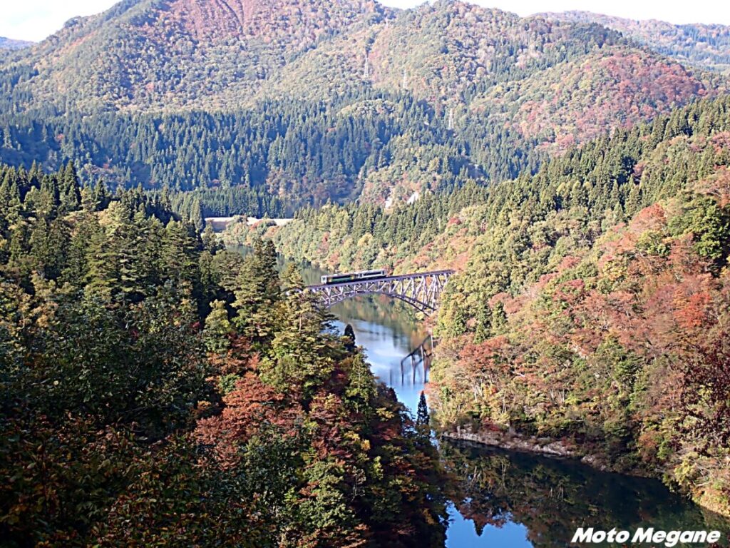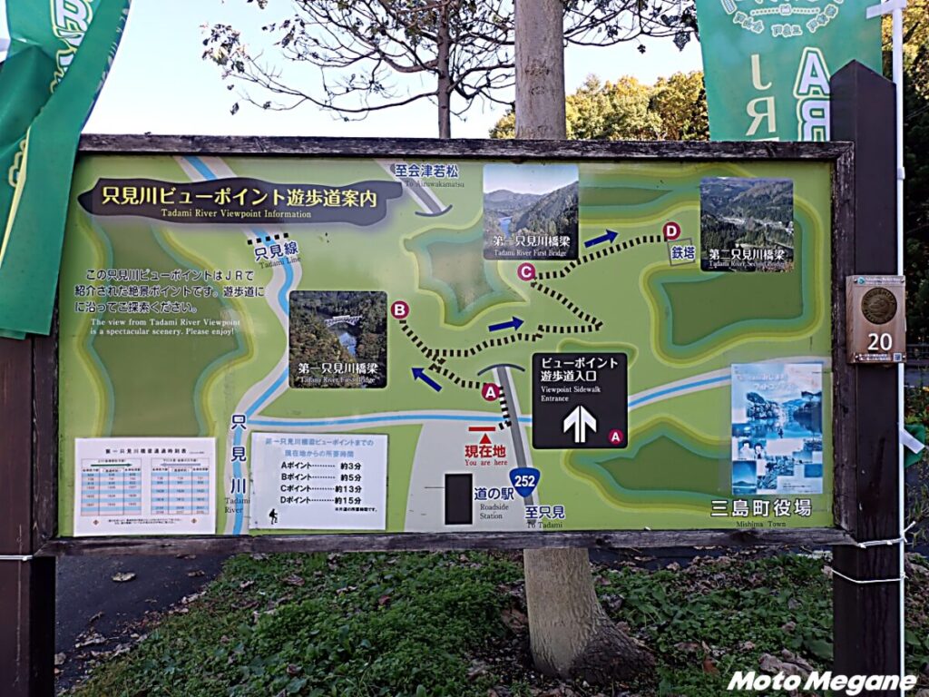 只見川に架かる橋梁と通過する列車の絶好の撮影スポット。道の駅駐車場の奥から遊歩道が続いている。第一橋梁は山を登った先の3ヶ所の展望所から望むことができ、上の展望所からは橋の全景が水面に映る光景を見られる。展望所には列車の通過時刻が掲示されているので、鉄橋を走る列車の時刻はここでチェックが可能だ。