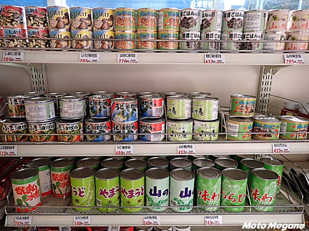 三島町で製造される山菜とキノコの缶詰。なめこや舞茸ご飯の素、ワラビなどの山菜と、さまざまな種類があり、サイズも豊富。小さいサイズの缶詰は持ち運びやすく、ツーリングの際のお土産にもピッタリ。レトロな絵柄のラベルがいい感じの缶詰だ。