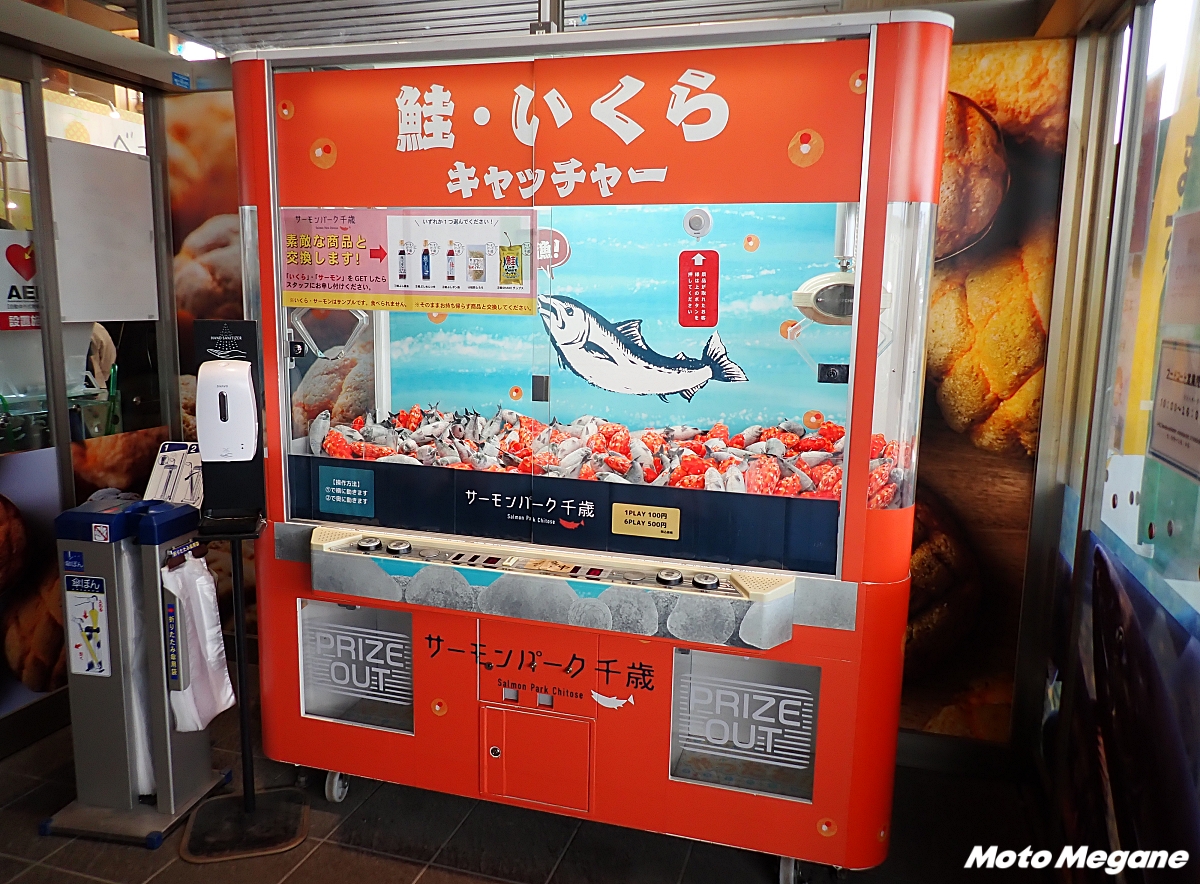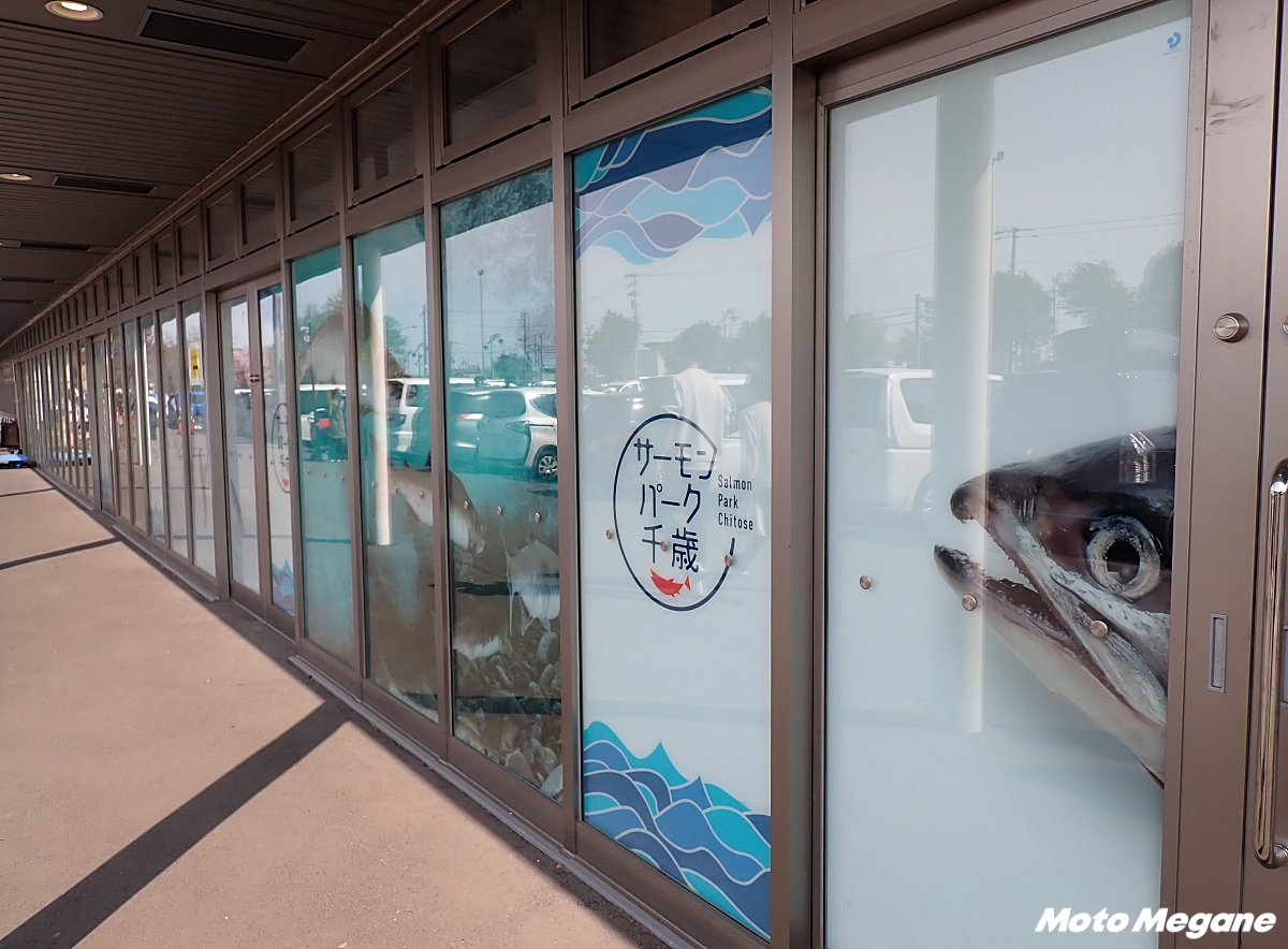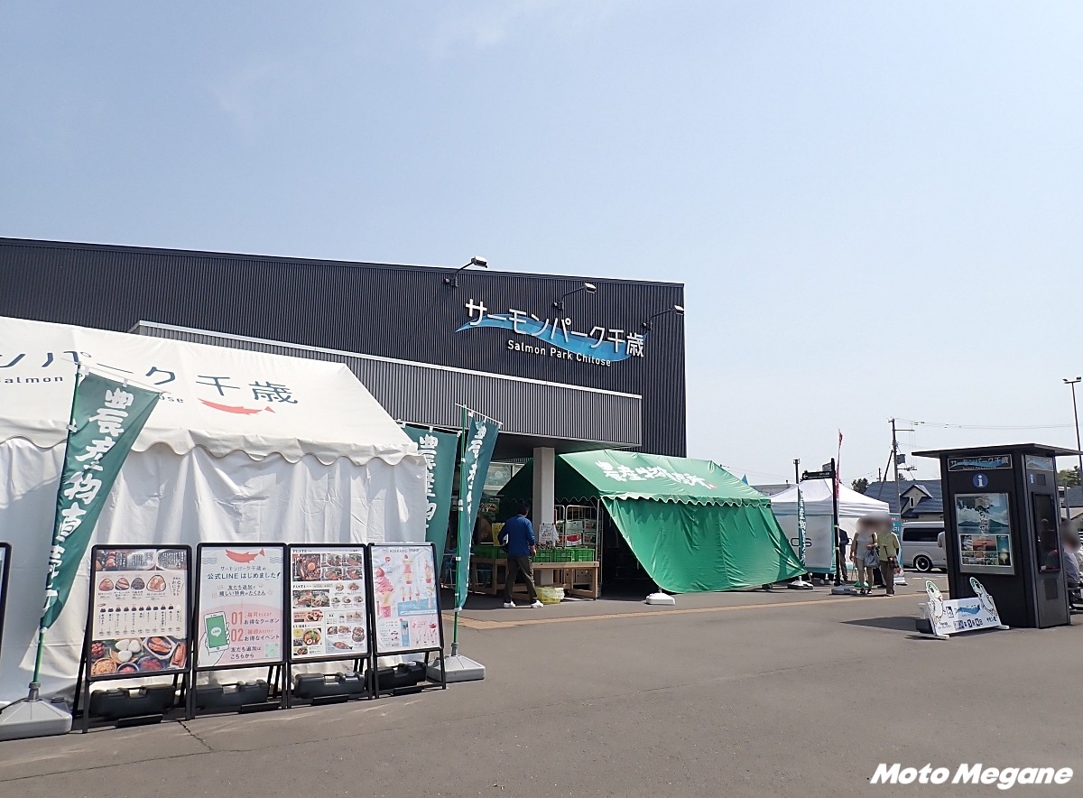 『道の駅 サーモンパーク千歳』はR337沿いのまちなかにあり、道央自動車道の千歳ICから約10分とアクセス良好な立地だ。駐車場は広く、バイク用の駐車場も用意されている。2023年8月にリニューアルグランドオープンし「We love サーモン 千歳にcome on!」をコンセプトに、鮭やサーモンを使ったオリジナルメニューや多彩な商品を取り揃える施設となった。