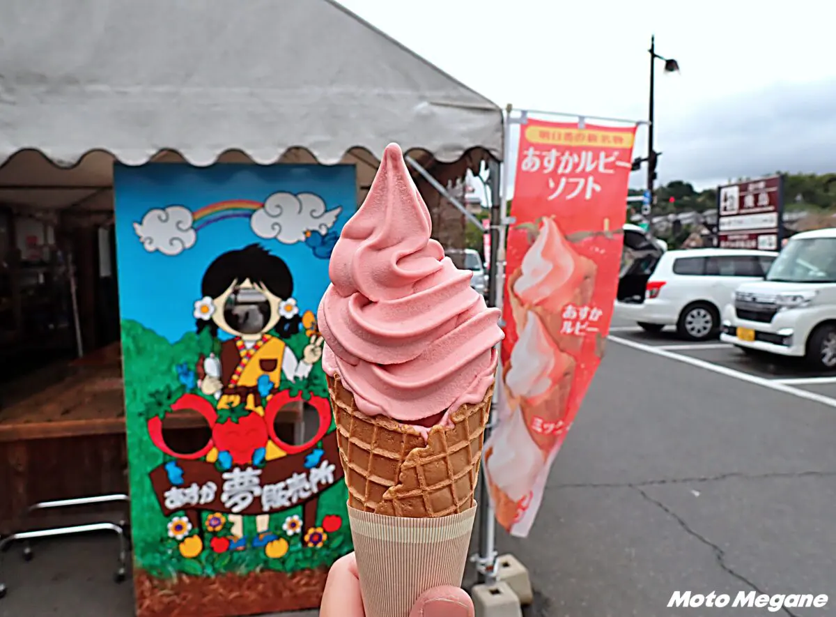 香り・味・口当たり、どれも抜群!ソフトクリームを顔に近づけると、イチゴの香りが漂ってくる。ここまで香り高いソフトクリームはなかなか無い。一口食べるとイチゴの濃厚な甘みを感じ、でも酸味がしっかりとあるので後味はサッパリ。完熟イチゴを潰した時の果汁のような、濃厚なイチゴの風味だ。果汁感が多いとシャーベット系食感のものが多いが、これはなめらかな口当たり。イチゴのツブツブ感も感じられる。クリーム感がないタイプなので、あすかルビー本来の味わいを楽しめるソフトクリームだ。
