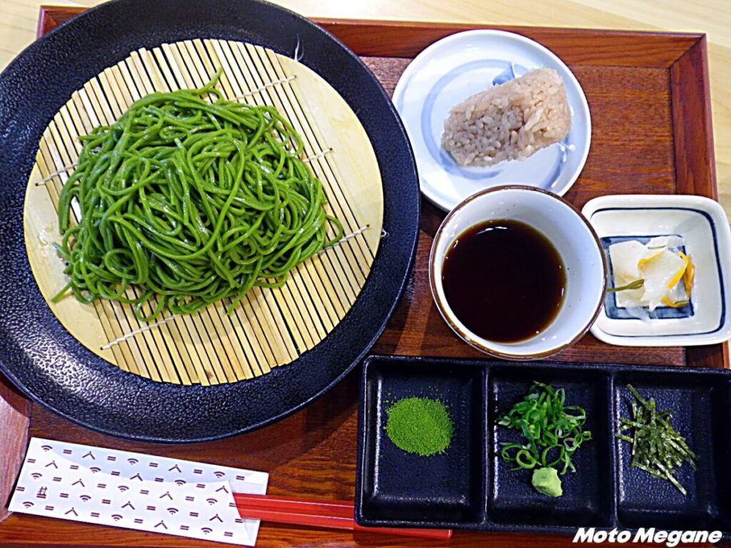 食堂の名物で、一番人気のメニュー。南山城村産の一番茶を練りこんであり、抹茶の鮮やかな色と風味が特徴。厳選した抹茶をふんだんに加えた、無添加無着色のこだわりの茶そば。定食には、水の代わりにほうじ茶で炊いた茶飯がついてくる。