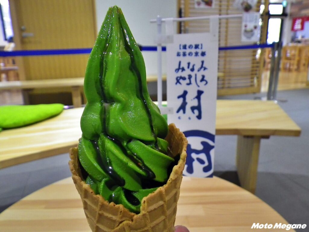 村茶とは、南山城村で生産されたお茶のことで、お茶農家ごとブレンドされていないことが特徴。単一農園単一茶種のお茶はそれぞれ異なる味わいで、渋み、バランス、旨み、甘みなど好みのものを楽しめる。村抹茶ソフトクリームには上質な春摘み抹茶がたっぷりと使われており、抹茶のほのかな苦みと超濃厚な味わい。さらに濃厚抹茶ソースがトッピングされており、これでもかというくらい、抹茶を堪能できる一品。甘さも控えめで、さっぱりとした後味で、甘いものが苦手な人にもオススメ。石臼引きの一番茶を使った、ここだけでしか食べられない贅沢ソフトは、行列必至の大人気商品だ。