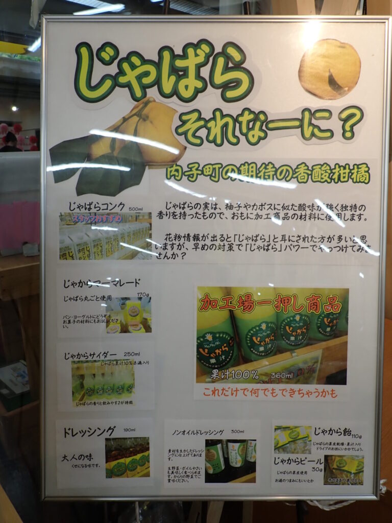 香酸柑橘の一種で、花粉症などのアレルギー症状の緩和抑制に効果があるといわれている。花粉症に効くと言われる機能性成分は皮の部分に多く、じゃからピールや、内子町特別栽培農産物等認証のじゃばらを丸ごと使ったマーマレードも人気。果汁や、飴、サイダー、ドレッシングなど、さまざまな商品がある。