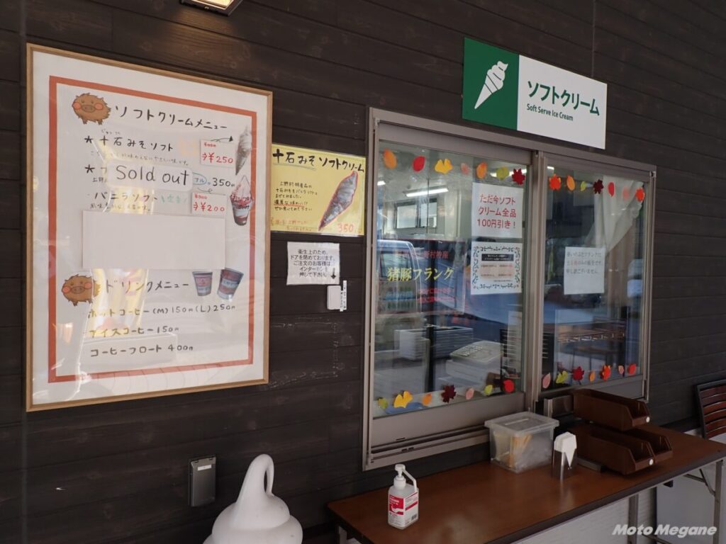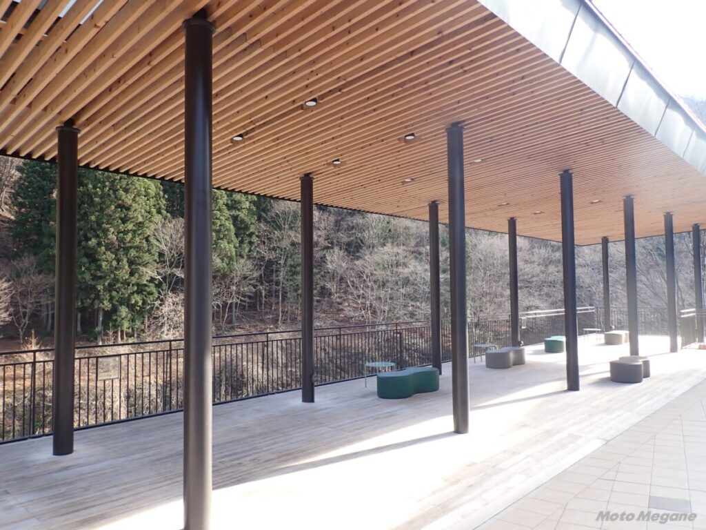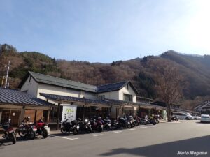 道の駅は国道299号沿いにあり、休日なると多くのライダーが訪れる人気のツーリングコース。道の駅から道路を挟んで反対側には、屋根付きの二輪車専用駐輪場が広いスペースで用意されている。
