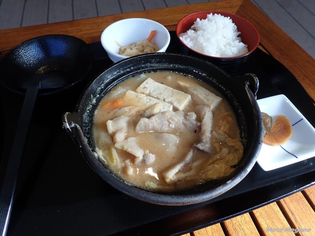 特産の「いのぶた」を十石みそで煮込んだ鍋。いのぶた肉はクセがなく、肉の甘みと旨みが、十石みそ仕立てのスープと相性抜群。十石みそのやや甘みとコクのある味わいに、いのぶた肉の旨みが加わり絶品。野菜や豆腐などもたっぷりと入り、お腹も大満足。いのぶたを堪能できる村の名物料理。
