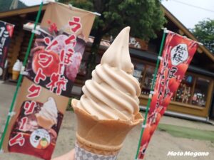 松梅産の干し柿をふんだんに使用した道の駅オリジナルのソフトクリーム。干し柿のやさしい風味を味わえる。干し柿を40度前後のラム酒に1ヶ月漬け込んでからソフトクリームにした「ラムほし柿ソフト」も販売しており、こちらはラム酒の風味がほのかに香る大人のソフトクリーム。アルコール分は飛んでいるそうなので、ツーリングの途中でも安心して食べられる。