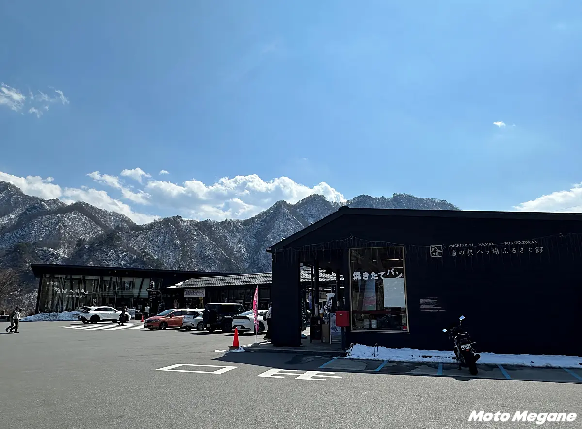 『道の駅 八ッ場ふるさと館』は、R145号沿いにあり、アクセスは良好。広々とした駐車場にはバイク用の駐車スペースも用意されている。不動大橋のたもとにあり、道の駅からはあがつま湖を見られるロケーション。スカイツリーと同じ高さの標高634mにある道の駅だ。