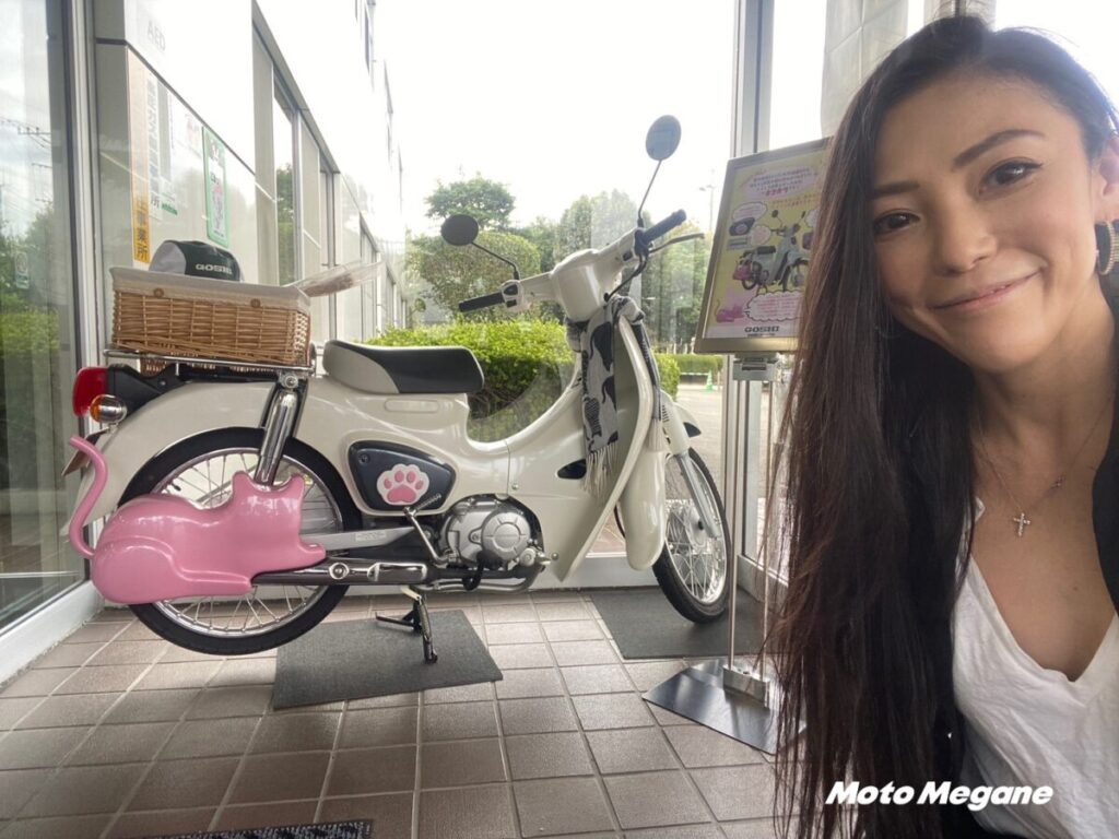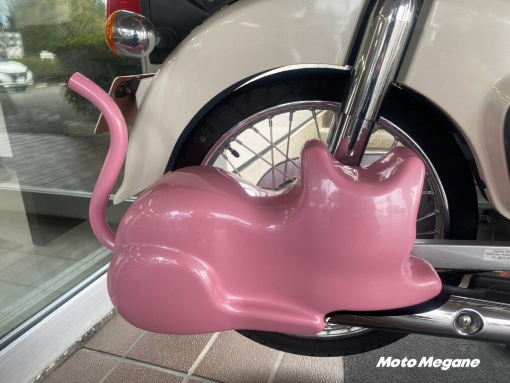 女性社員さんがプロデュース。全体のカラーも若手女性社員さんのアイデアだそうです。いつも猫ちゃんと一緒に居られるなんて嬉しいバイク。マフラーのフォルムはスリスリしちゃいたいぐらい可愛い!