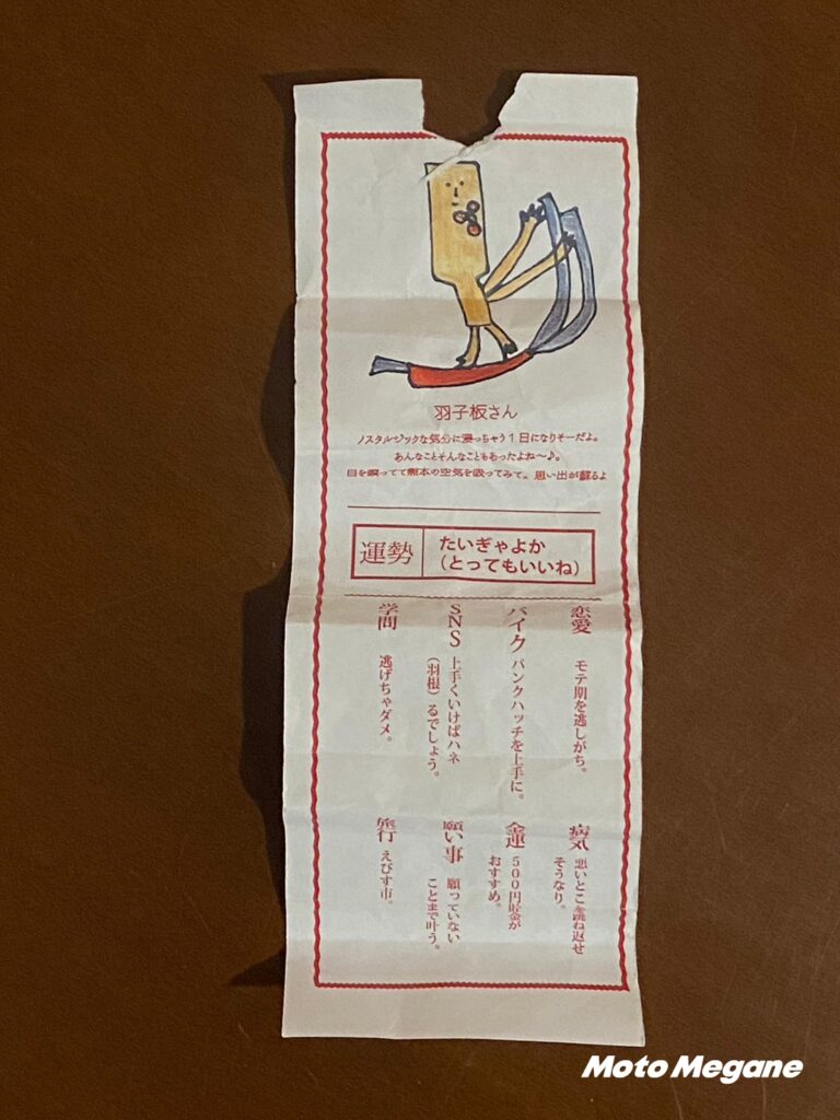 阿蘇へのツーリングの安全を祈願して、はたまたHSR九州でのレースの勝利を祈願して初代ミニスカポリスにして占い師の福山理子がバイクおみくじをつくりました!!熊本の特産品をキャラクターにしてみました!みなさんの安全な旅路を祈願して。あなたの運勢はどうでしょう?
