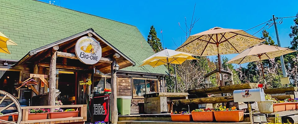 BIGONEは千葉県夷隅郡大多喜町・横山地区の最も高い山の山頂の「キャンプ場内にある山小屋風のカフェ」です。この山頂の施設は「風の村」と呼ばれ、山の尾根から吹く気持ち良い風がつねに吹く、まるで県外の高原へ出かけたような休日を過ごせることから、首都圏からわずか1時間の身近な憩いのオアシスとして愛されています。 BIGONEは、この恵まれた環境を最大限に活用し「多くのテラス席やガーデン席」をもつ「秘境カフェ・秘境バーガーショップ」として、多くのオートバイ乗りやサイクリストの皆様に「聖地」とSNSなどで紹介頂き、のんびりとした時間と、お客様たちの楽しそうな笑い声がこだまする場所として、心を込めたお食事と接客で家族連れのみなさまやバイクや自転車でお越しになる方々に愛され守られてご利用頂いております。 またClub BIGONEは一般社団法人Peacemakerと連携し「地域社会貢献や児童虐待防止活動などの活動」を積極的に行い、バイカー(ライダー・サイクリスト)で出来る地域社会貢献を応援し、雑誌やTVメディアとも連携、提携し様々な社会貢献活動や地域活性化活動などを実施・運営しております。