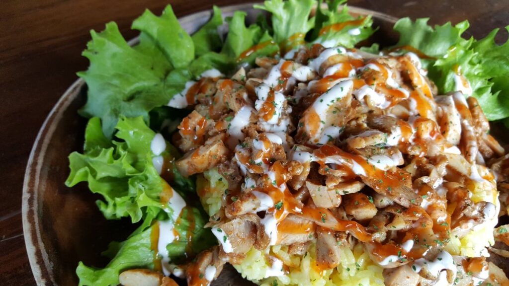 チキンオーバーライス、バッファローウイング、グリルドチーズ
