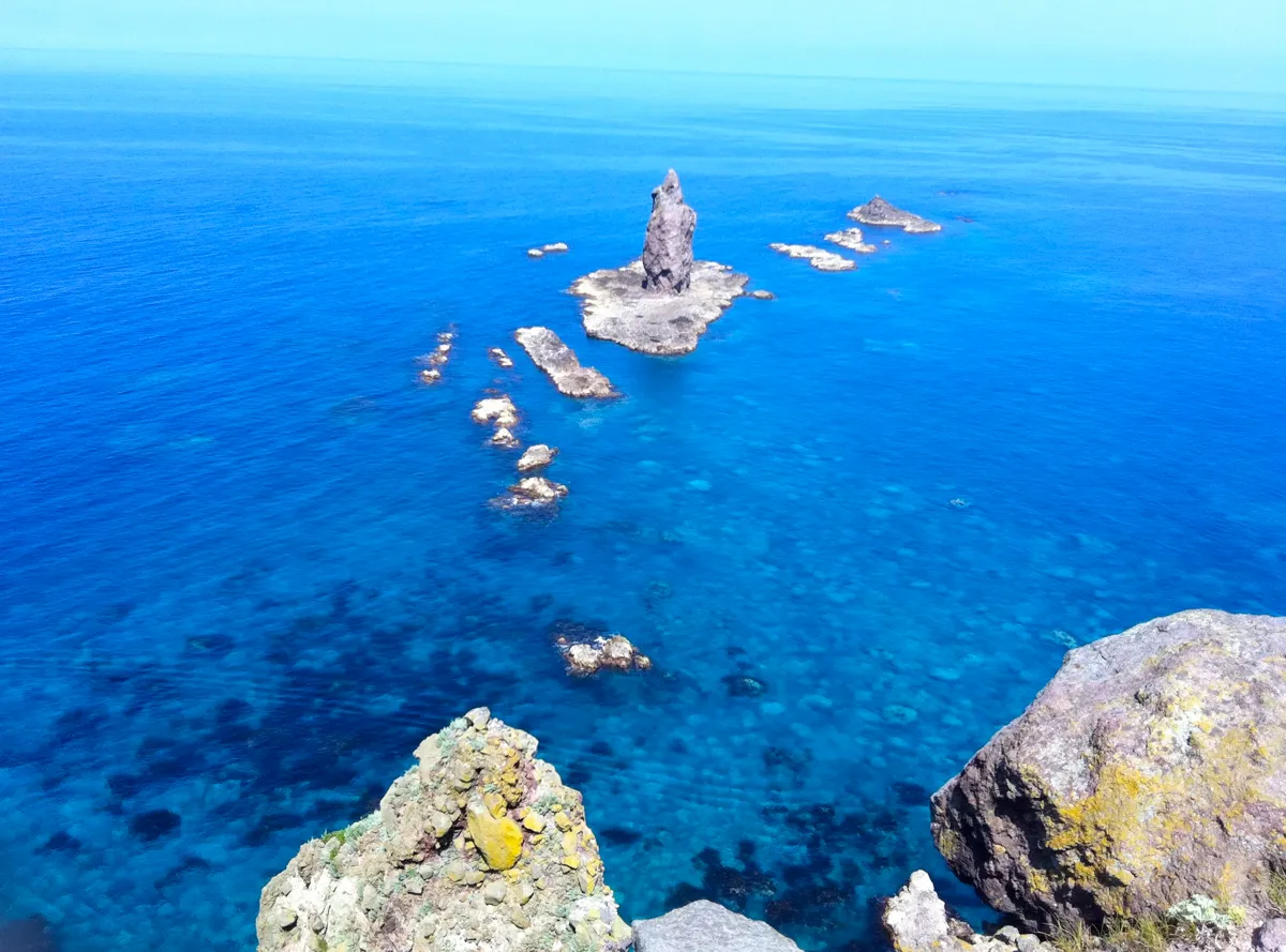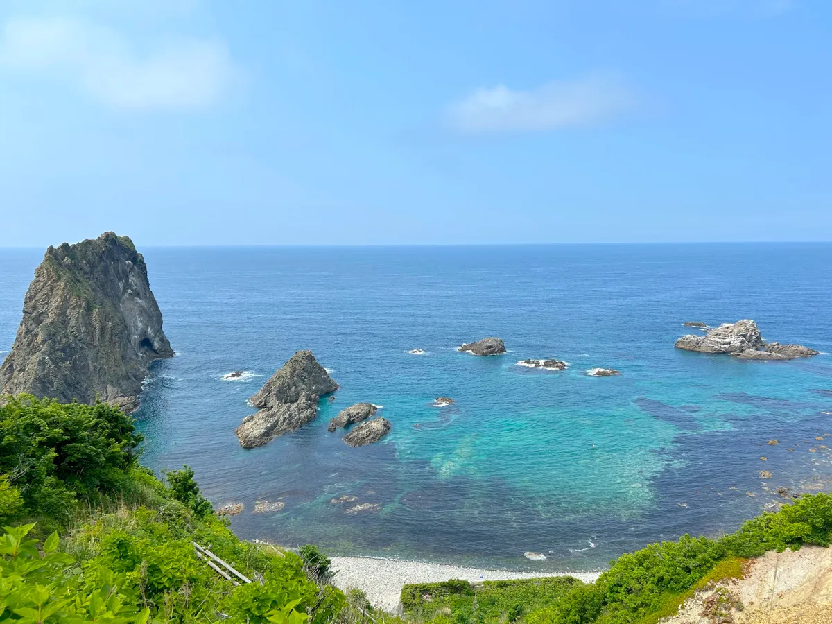 実は神威岩へと続く「神威岬」は、長い間「女人禁制の地」として知られていましたが…現在は女性の立ち入りも可能となっており、絶景の遊歩道を約30分ほど歩くと(なかなかの距離)まるで沖縄のような美しい海の上に佇む神威岩の神々しい姿を拝むことができます!