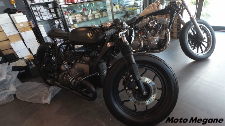 入るとすぐに、ハーレーのスポーツスターとBMWのR100らしきシンプル・イズ・ベストなカスタム車両2台がお出迎えです。