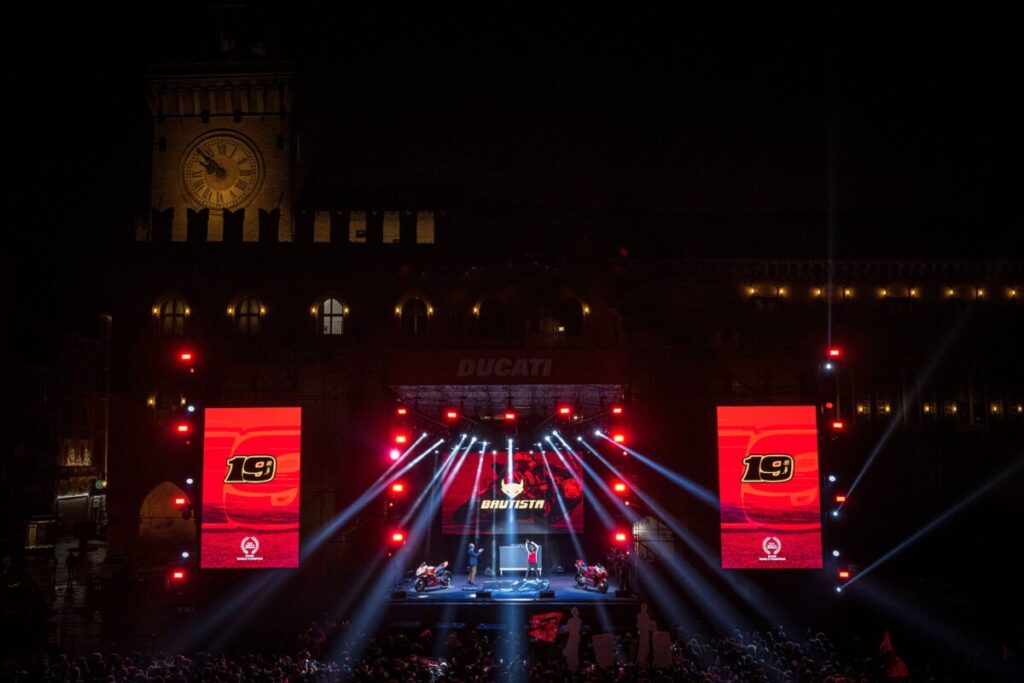 祝賀イベントは、12月15日(木)の午後8 時(現地時間)に始まり、その中心的な会場となったマッジョーレ広場には、あらゆる年代の数多くのドゥカティ・ファンが集まりました。このイベントでは、イタリアの歌手であるジョヴァノッティとのコラボレーションで知られるDJ兼レコード・プロデューサーであるフレスコによるDJセッションが行われ、ロマーニャ出身のコメディアン、ジュゼッペ・ジャッコバッツィがファンの方々を楽しませました。