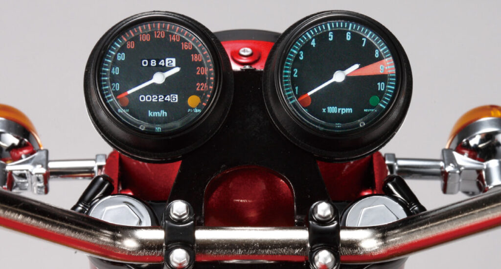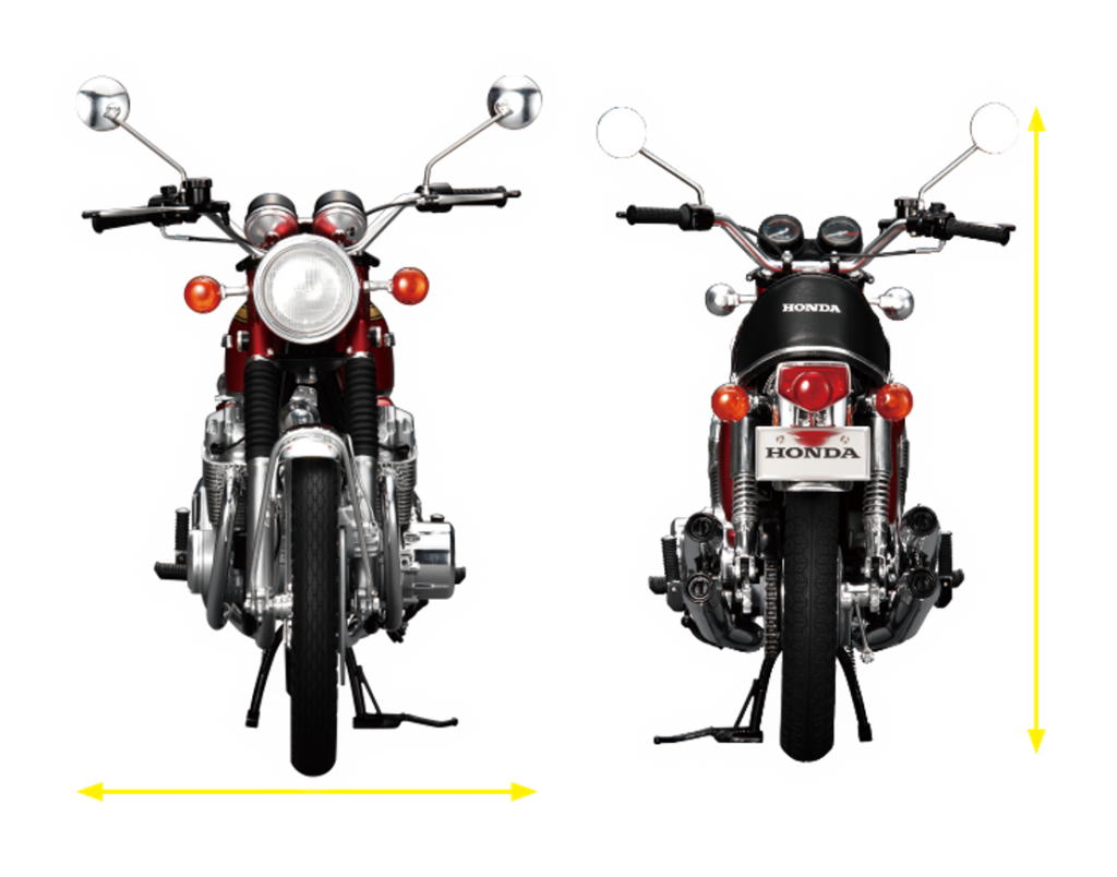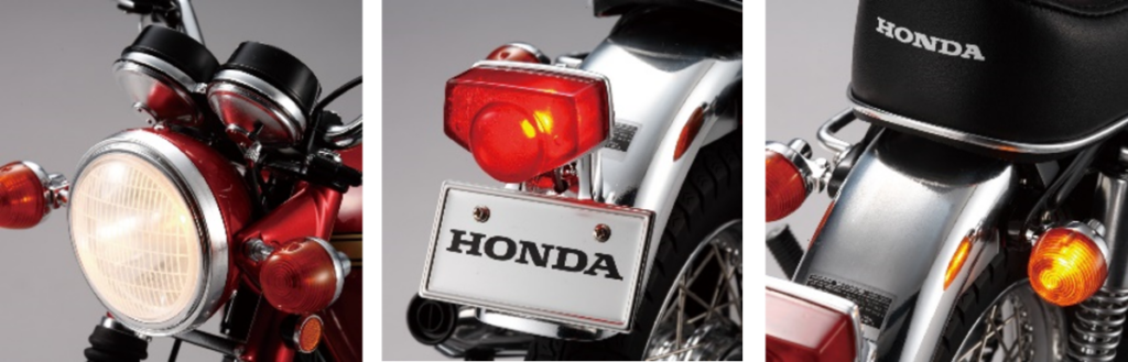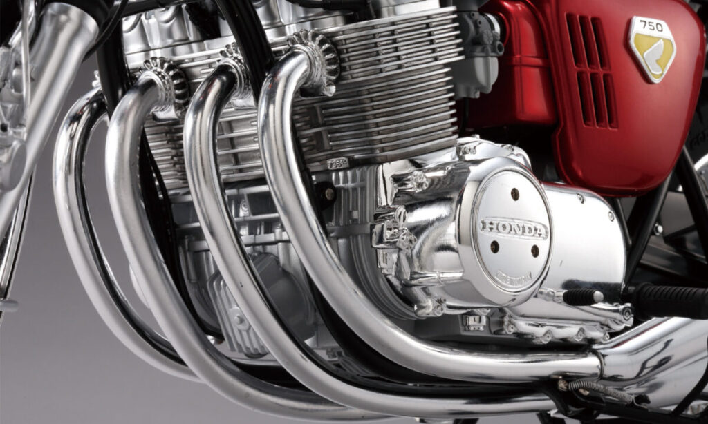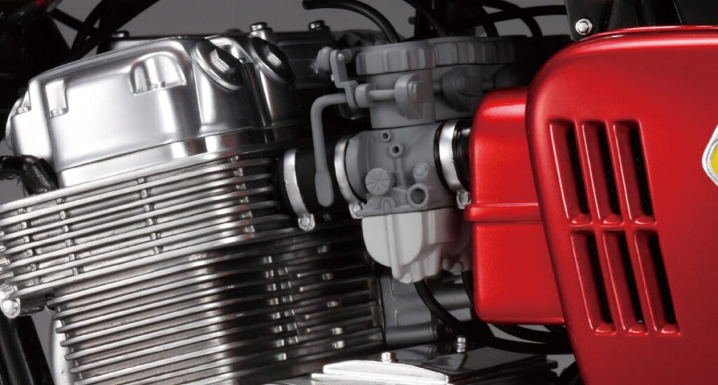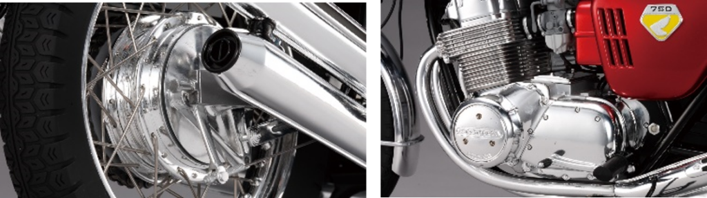CB750FOURを象徴する4気筒エンジンの造形、K0シリーズ初期生産車のみに採用された砂型クランクケースなど圧倒的な完成度で再現。実車の重厚感を再現するために金属パーツも多数使用されています。