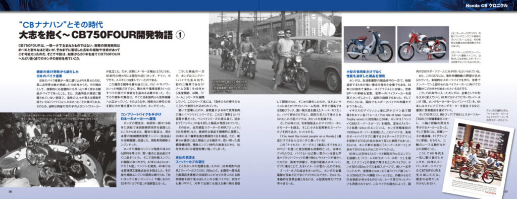 「CB750FOUR」をキーワードに、バイクブーム時代とその前後の国内外のバイクの世界を、当時の懐かしい写真や資料とともに紹介。CB750FOUR以外にも、同系列のCBシリーズや他メーカーのライバル車、派生モデルなど、CB750FOURと縁の深いモデルの開発話や、CBナナハンを取り巻く当時の世相などを読み物として連載。