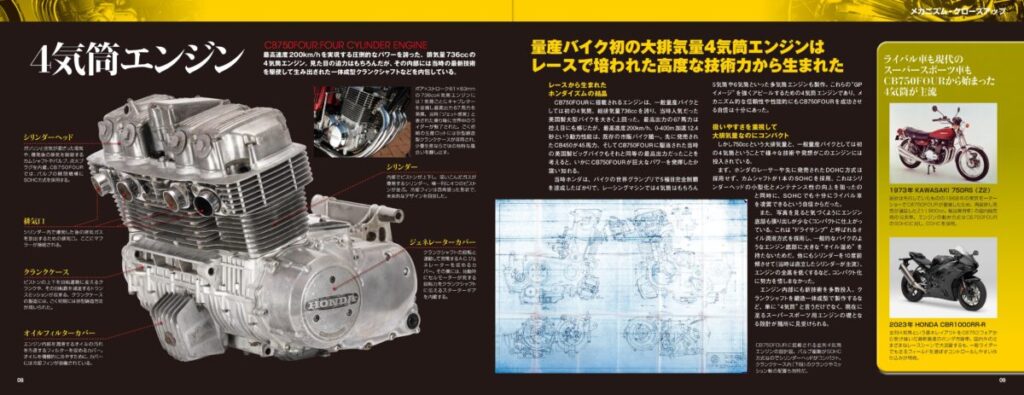 ネジ1本からタンクまで、数多くの部品やパーツで成り立つバイク。この章では、本誌モデルのCB750FOURを構成する部品やパーツについてわかりやすく解説。毎号1つの部品をクローズアップし、図版や細部に迫る写真と共に、構造や機能技術的変遷を紹介。